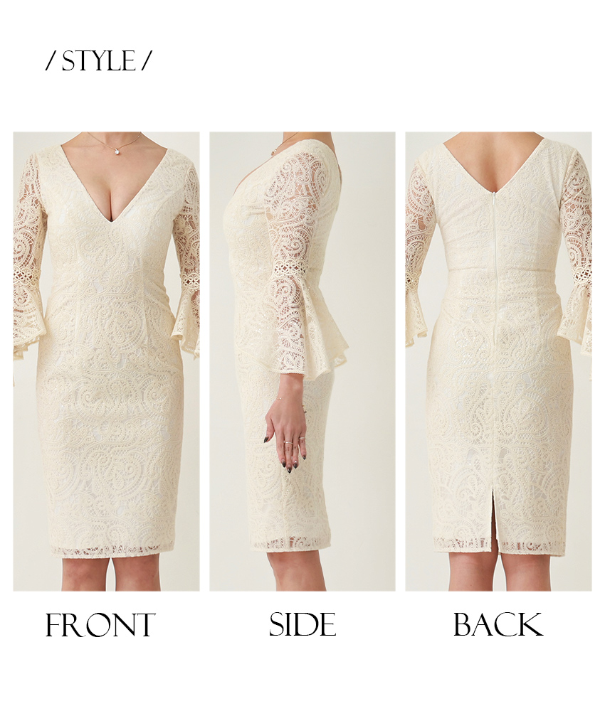 [ERUKEI]総レース・スパンコール・タイト・7分袖・Vネック・フリルスリーブ・ミディアムドレス・ワンピース[山崎みどり着用][送料無料] mywh [lk-e24140]