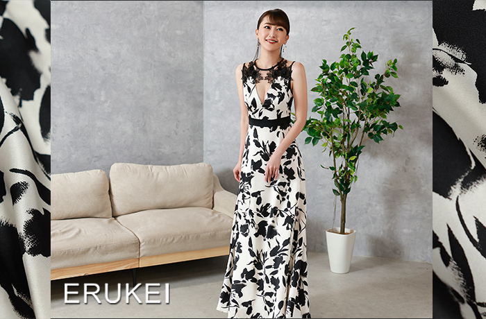 [ XS-Lサイズ / 1カラー][ERUKEI]モノトーン・リーフ柄・花柄・レースネック・Aライン・ノースリーブ・ロングドレス・ワンピース[薗田杏奈着用][送料無料] [lk-s25345]