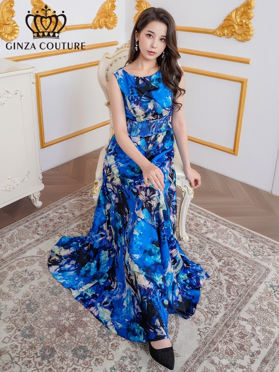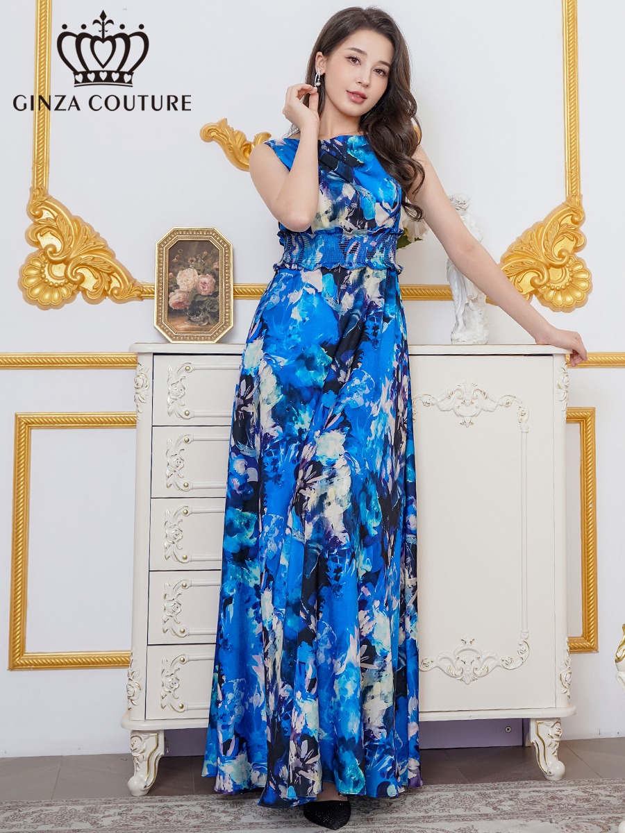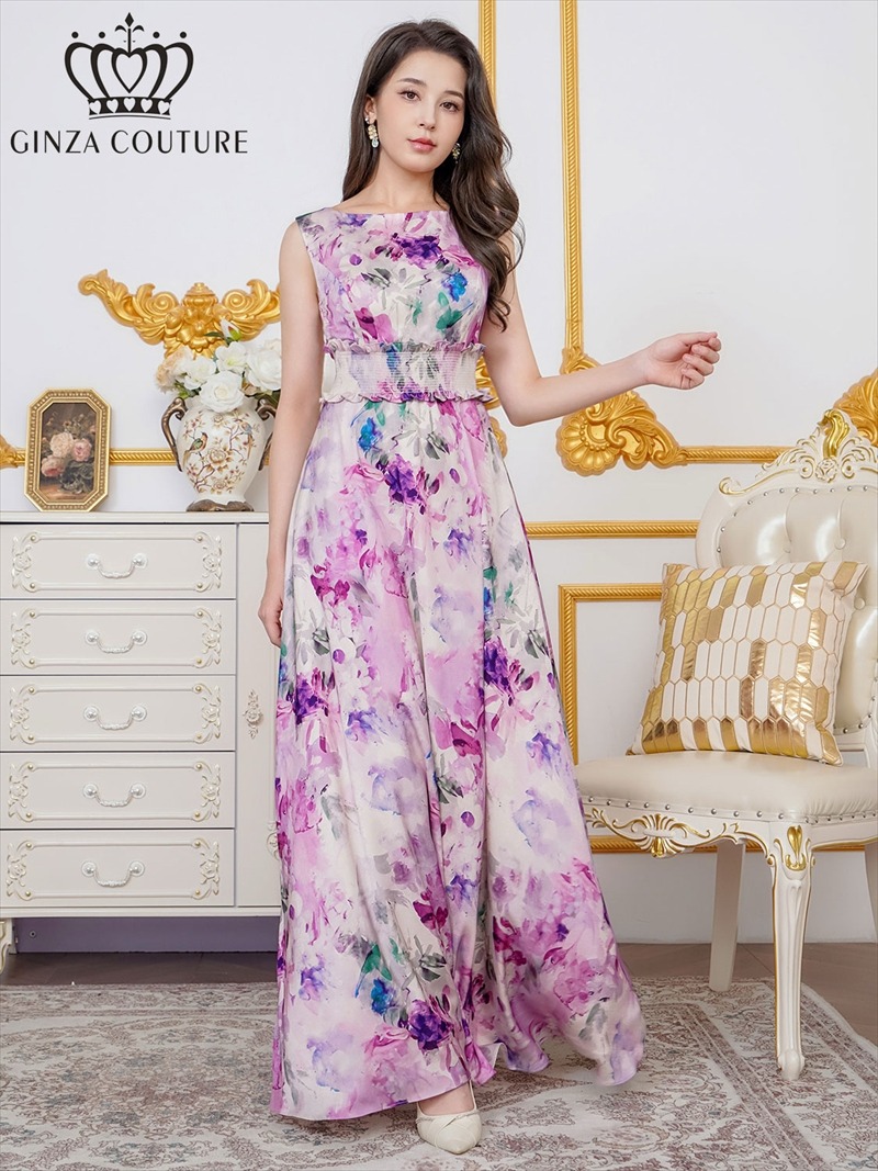 [ERUKEI]ノースリーブ・シワ加工サテン・フラワー柄・花柄・プリント・ウエストリブ・Aライン・ロングドレス[黒木麗奈着用][送料無料] [lk-c25105]