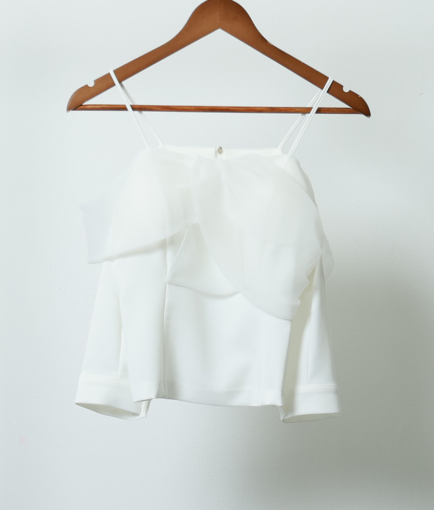 [韓国製][rinfarre]オフショルダー・肩紐・ホワイト・ブラック・ワンポイント・リボンモチーフ・上品・ブラウス・シンプル[薗田杏奈着用][送料無料]