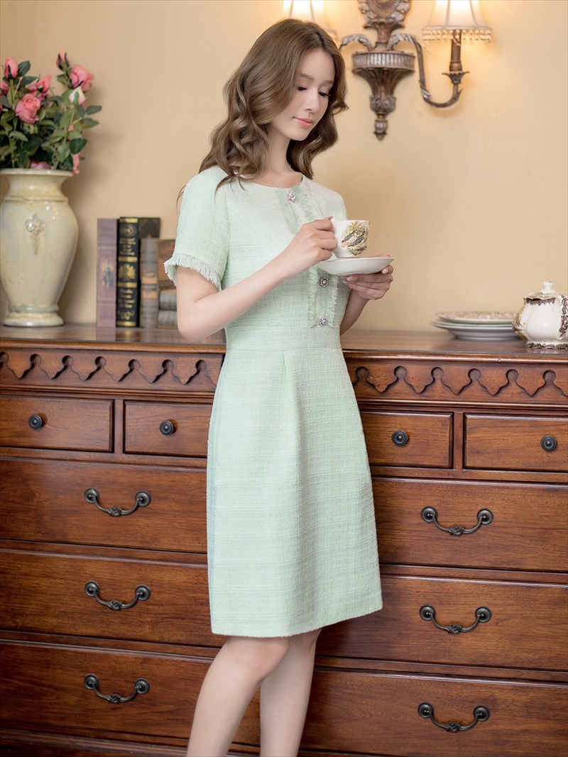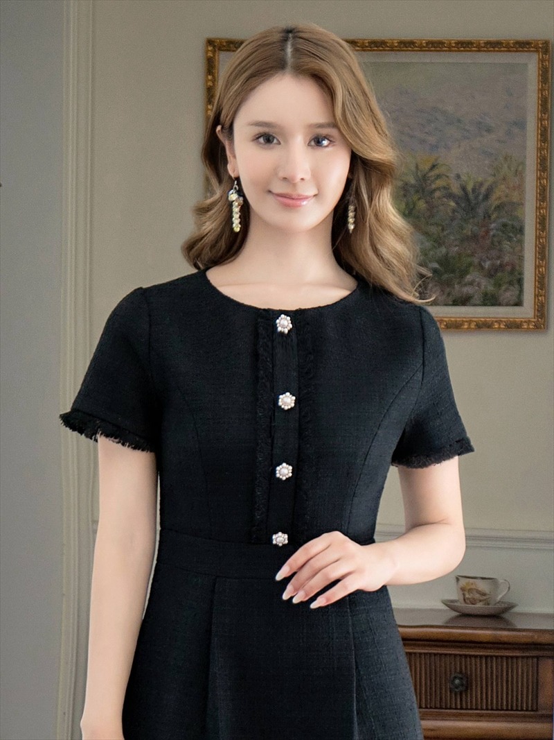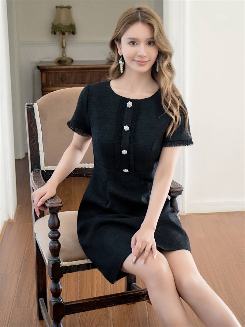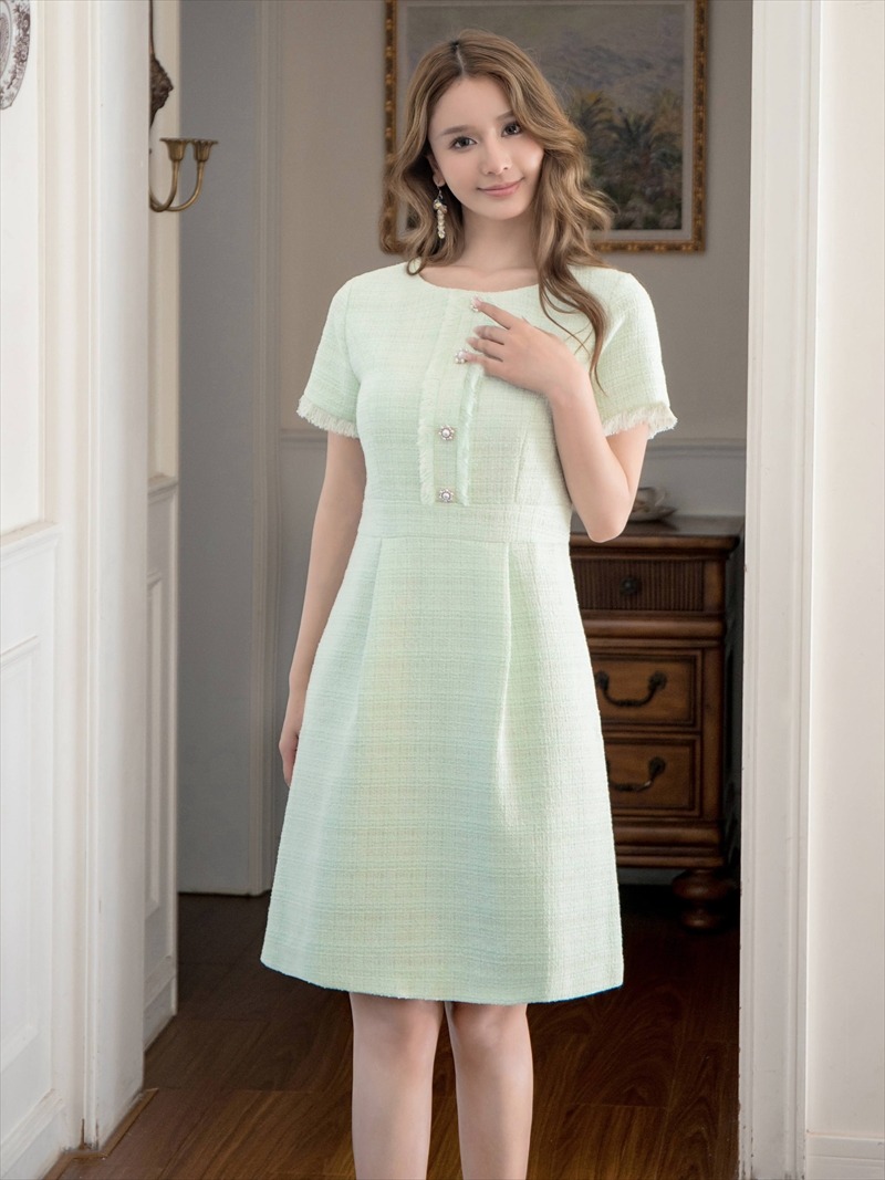 [ERUKEI/GINZA COUTURE]ブラック・パープル・ホワイト・グリーン・ パールボタン・半袖・ツイード・ミニドレス・ワンピース[送料無料] [lk-c1365]