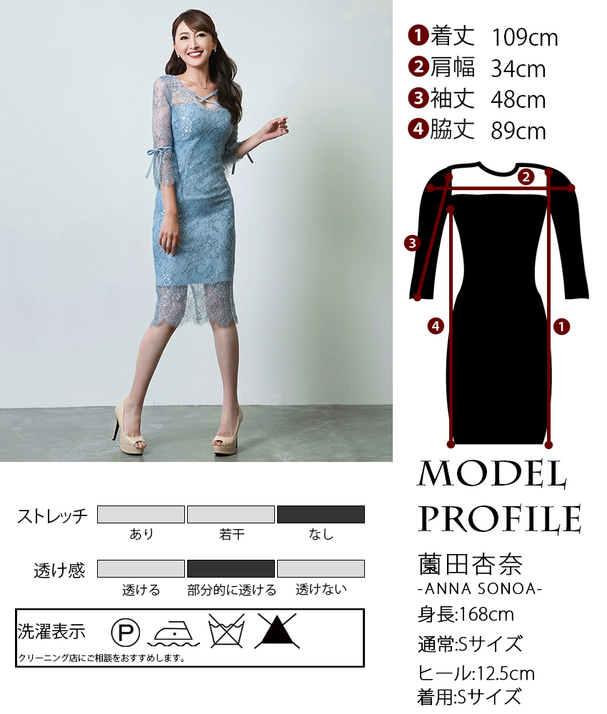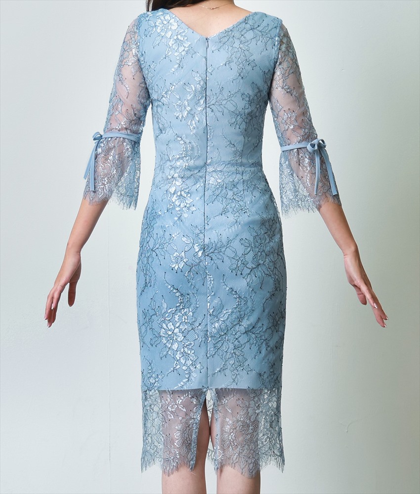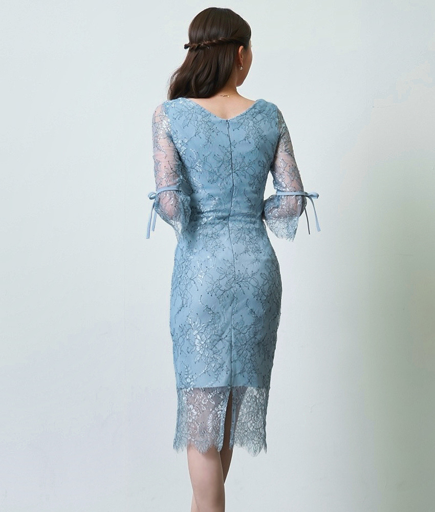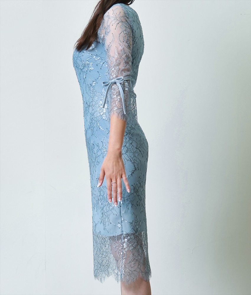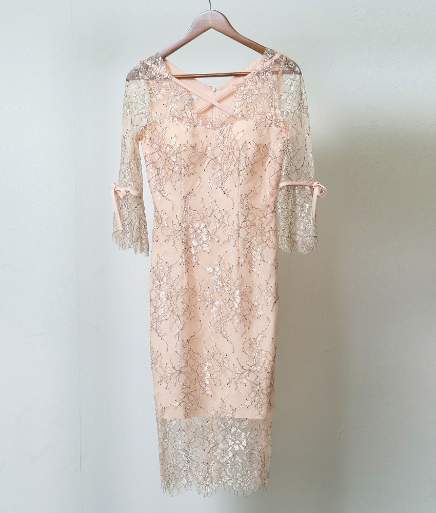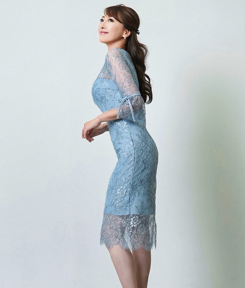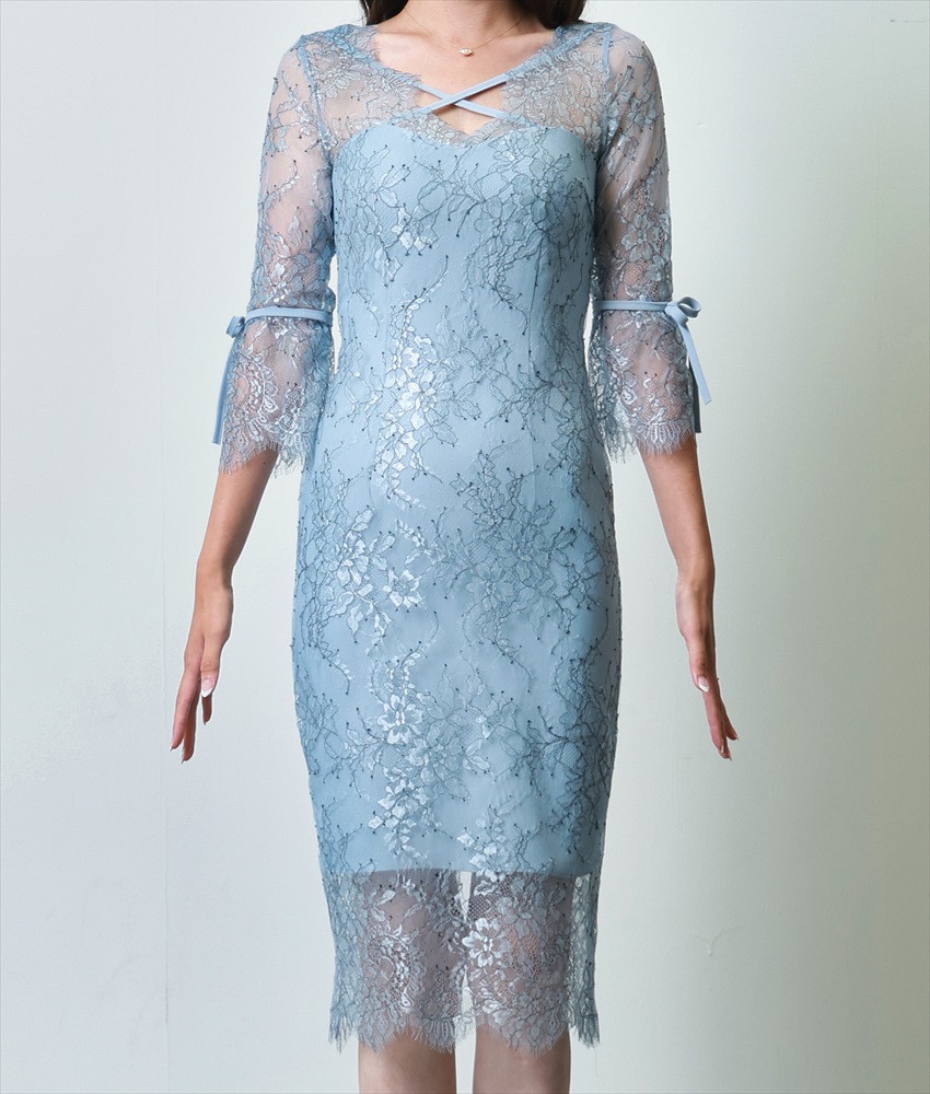 [韓国製][rinfarre]七分袖・クロス・リボン・総レース・膝丈・タイト・ミディアムドレス・ワンピース[薗田杏奈着用][送料無料] [cd-k06192gr]