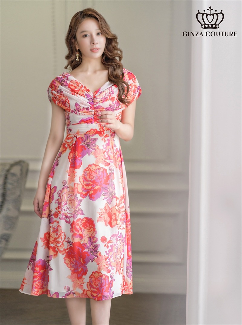 [ERUKEI/GINZA COUTURE]プリント・フラワー柄・ケープ風スリーブ・Aライン・ミディアムドレス・ワンピース[送料無料] [lk-c23109]