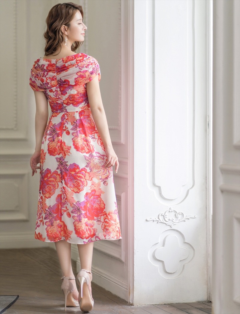 [ERUKEI/GINZA COUTURE]プリント・フラワー柄・ケープ風スリーブ・Aライン・ミディアムドレス・ワンピース[送料無料]