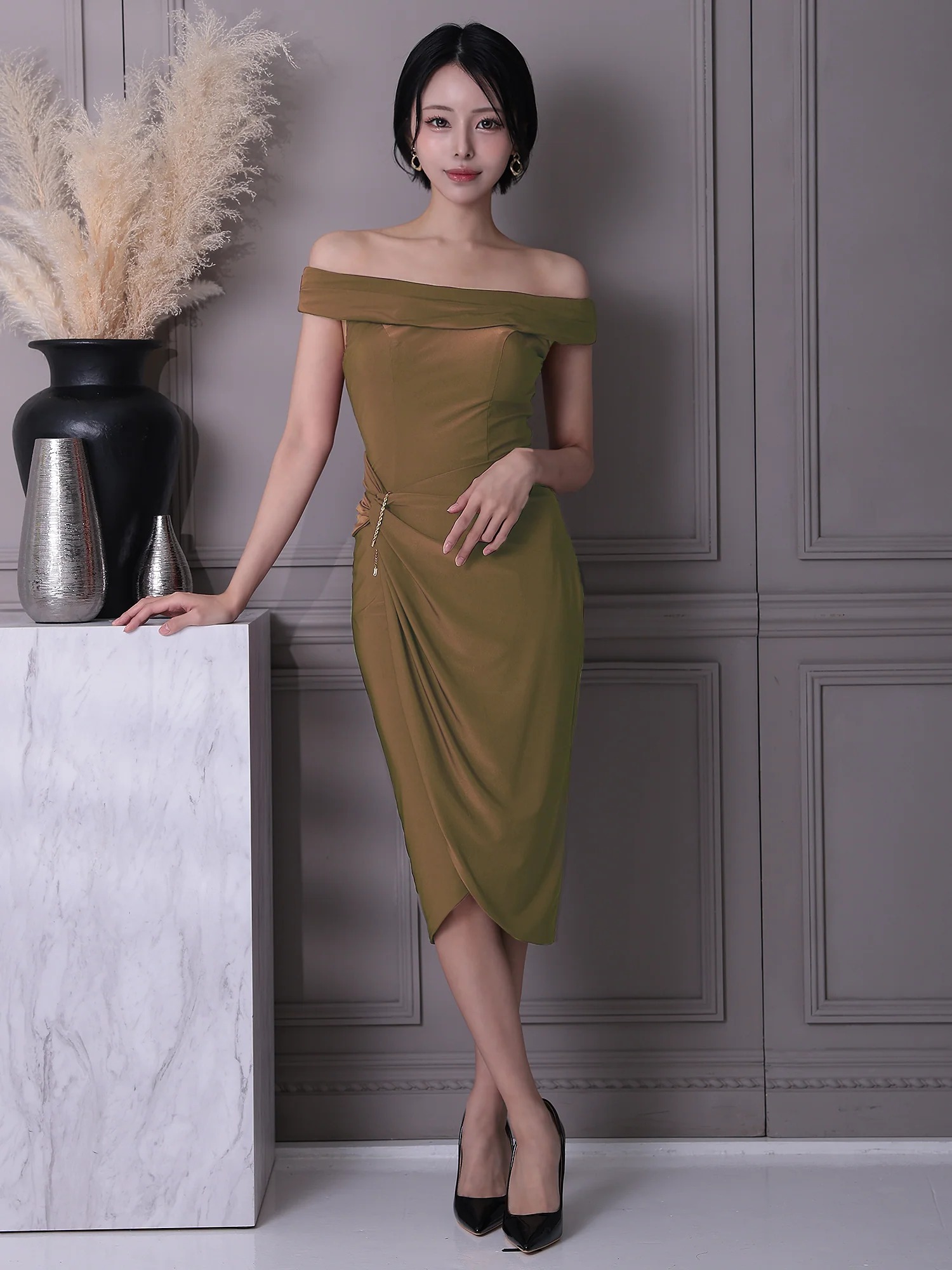 [韓国製][rinfarre]シンプル・オフショルダー・無地・ウエストタック・タイト・ミディアムドレス ワンピース[山崎みどり・れお着用][送料無料]myju [cd-k05916t]