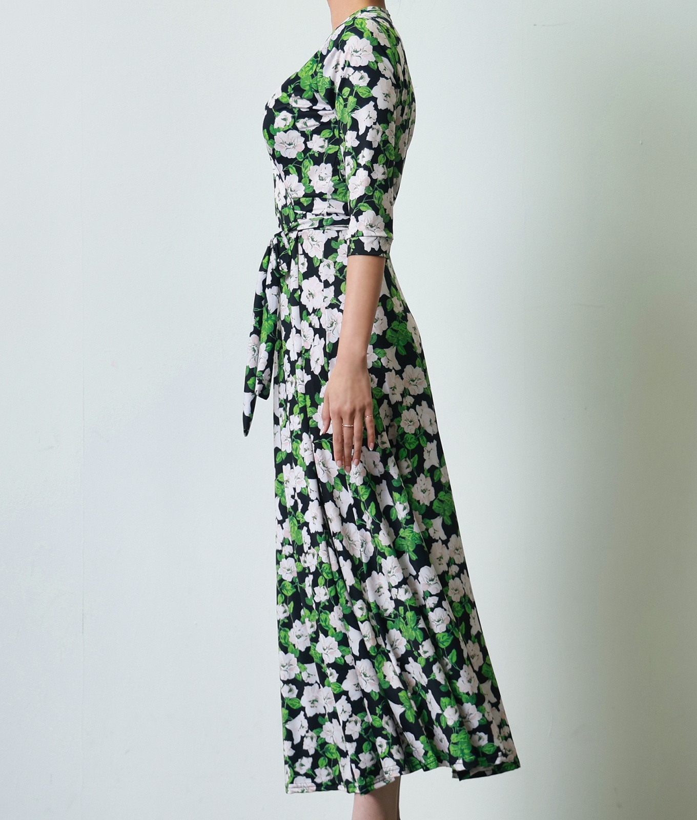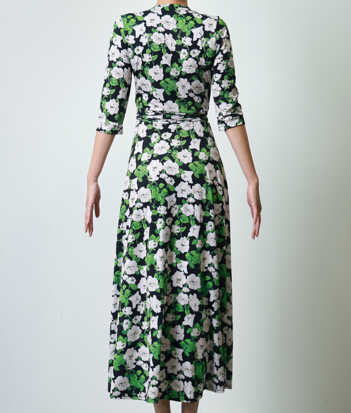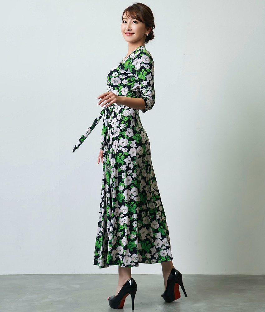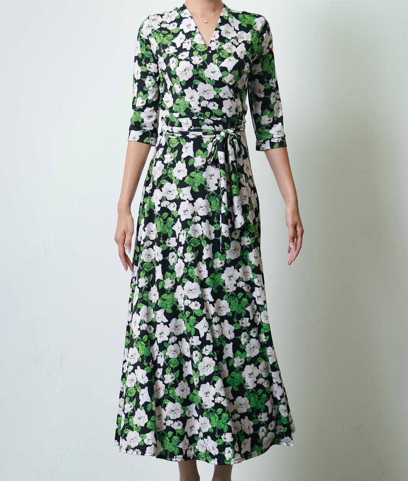 [韓国製][rinfarre]花柄・エレガント・レトロモダン・ブラック・Vネック・カシュクール・七分袖・マキシ・ロングドレス・ラップ・ワンピース[山崎みどり着用][送料無料]mybk [cd-k06138km]