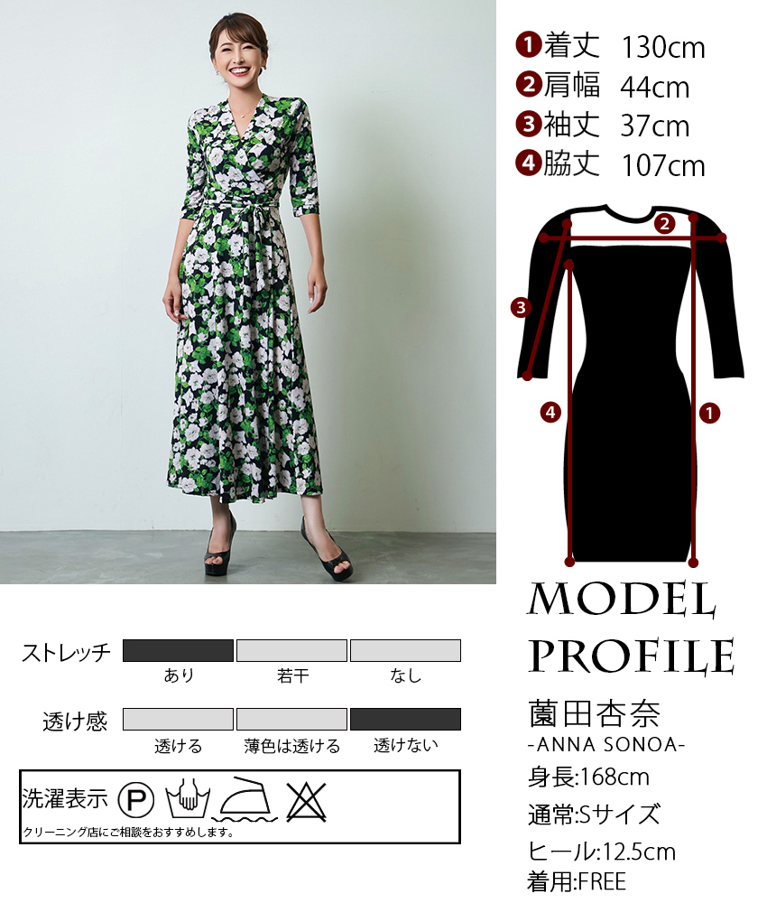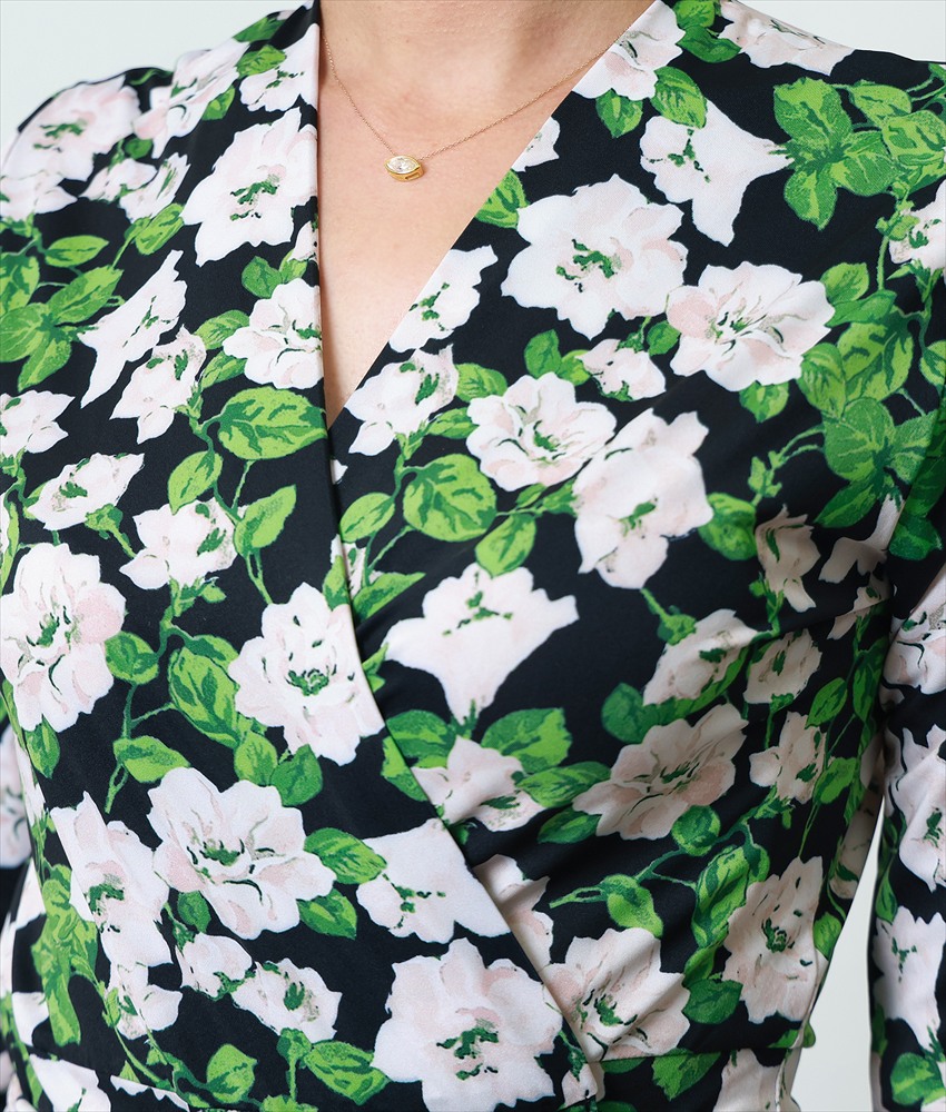 [韓国製][rinfarre]花柄・エレガント・ブラック・Vネック・カシュクール・七分袖・マキシ・ロングドレス・ラップ・ワンピース[薗田杏奈着用][送料無料] [cd-k06200km]