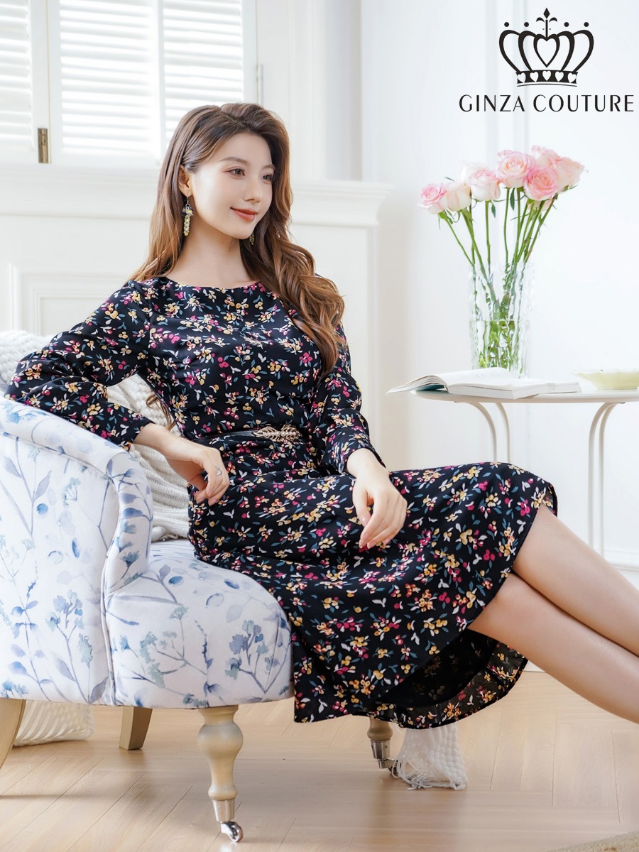 [ERUKEI/GINZA COUTURE]ブラック・花柄・プリント・長袖・ベルト・膝丈・Aライン・ミディアムドレス・ワンピース[送料無料] [lk-c23104]