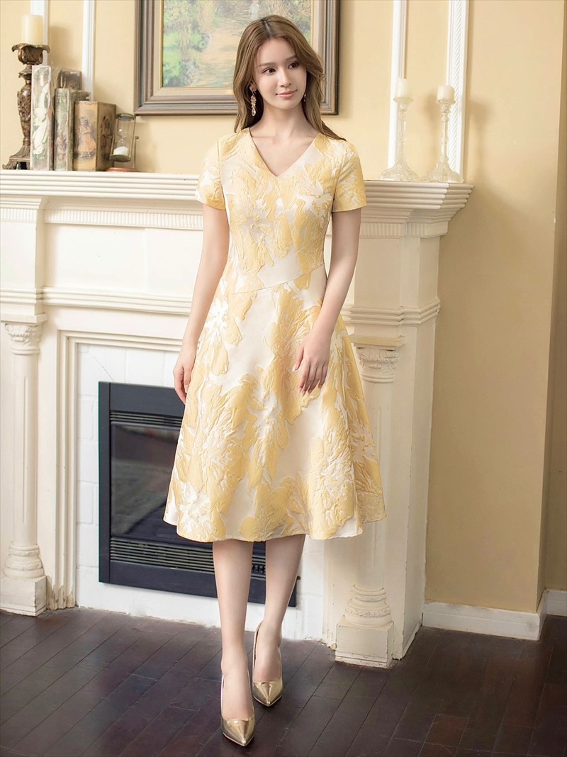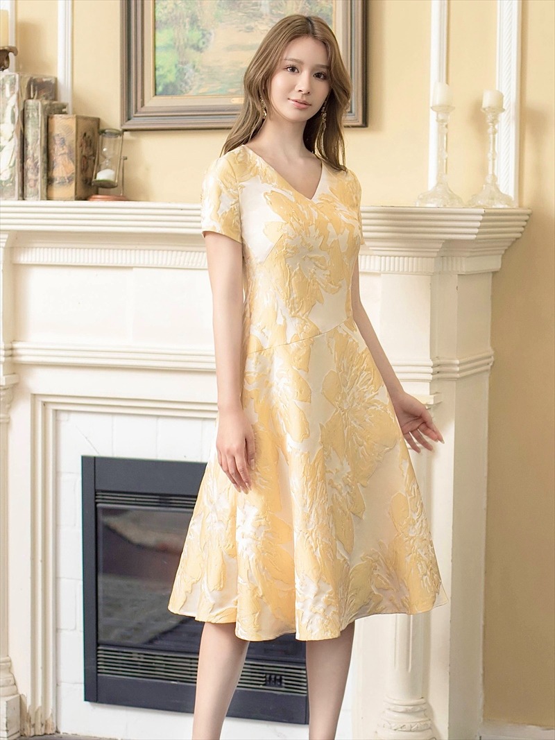 [ERUKEI/GINZA COUTURE]イエロー・ホワイト・ブルー・花柄・ジャガード・切り替え・Aライン・半袖・ミディアムドレス・ワンピース[送料無料] [lk-c22134]