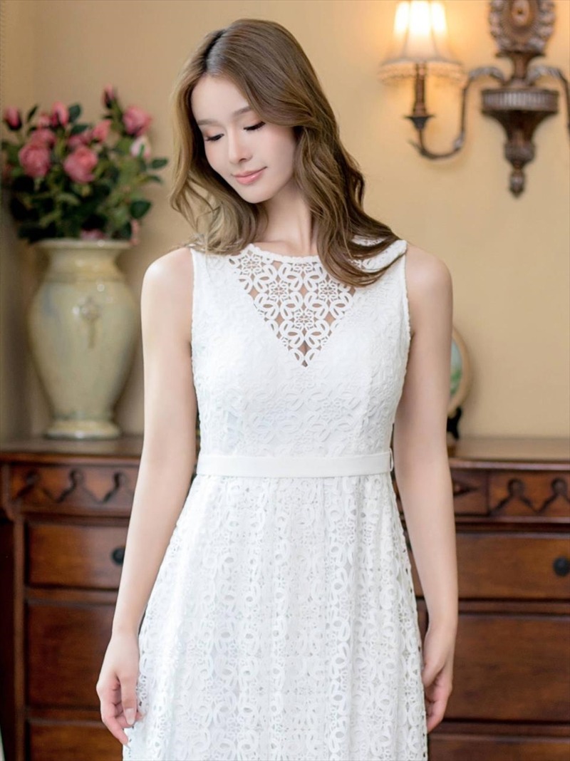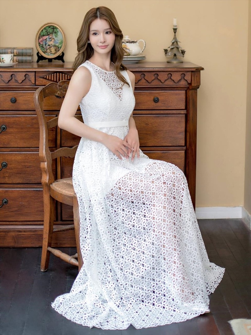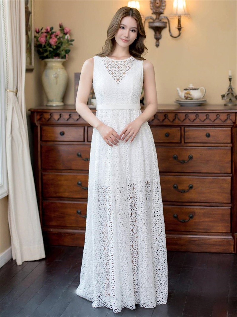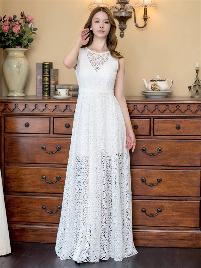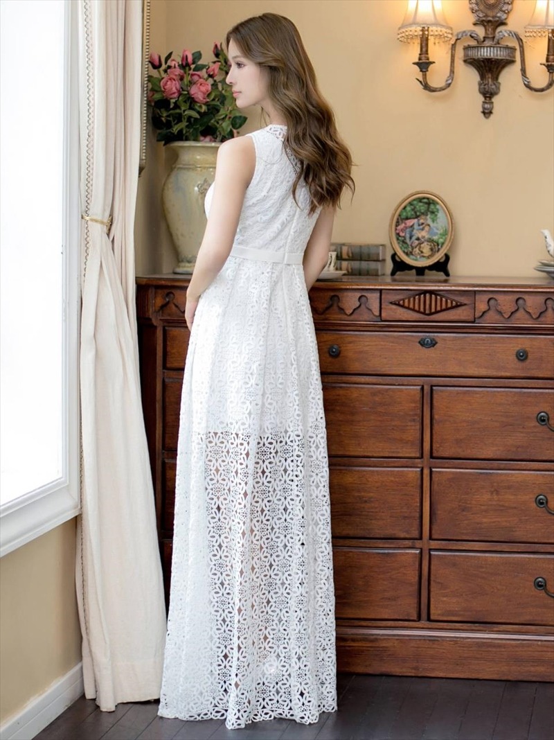 [ERUKEI]ホワイト・フラワー総レース・Vネック・エレガント・ロングドレス[送料無料] [lk-e22103]