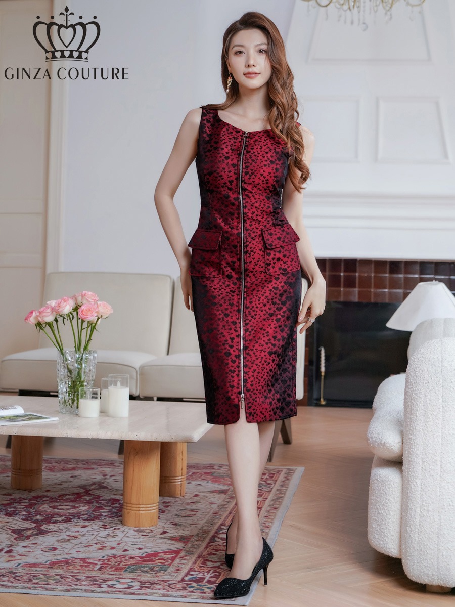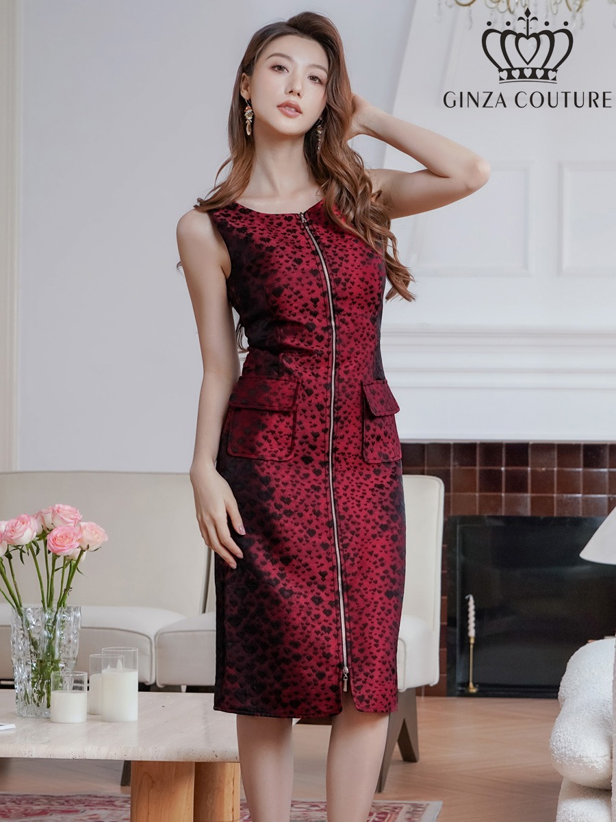[ERUKEI/GINZA COUTURE]レオパード柄・ジャガード・フロントジップ・ポケット付き・ノースリーブ・タイト・ミディアムドレス・ワンピース[送料無料] [lk-c22082]