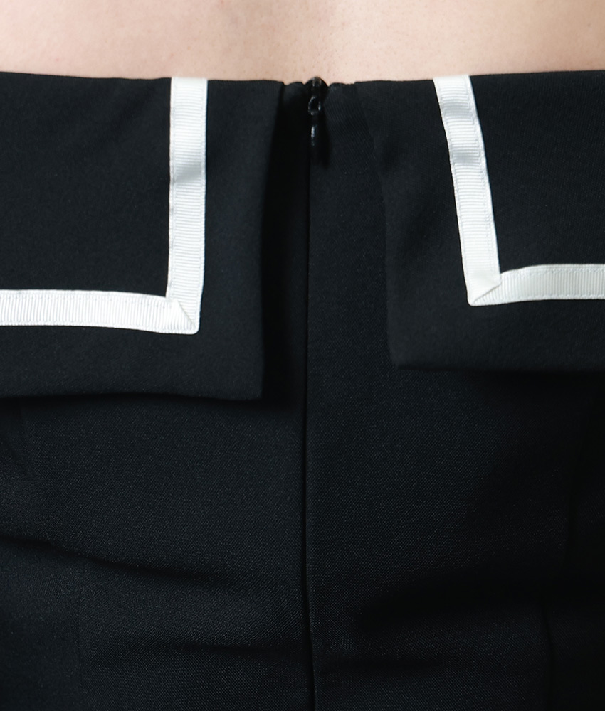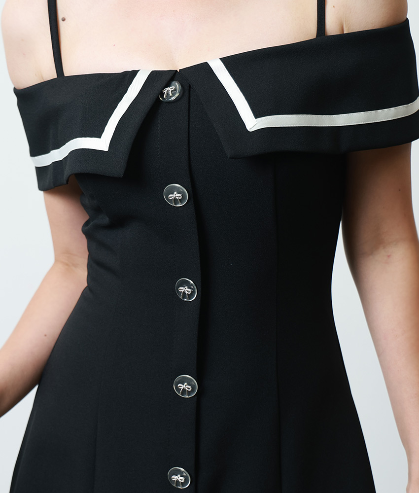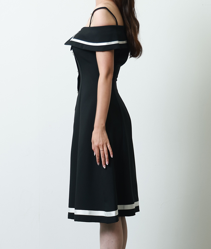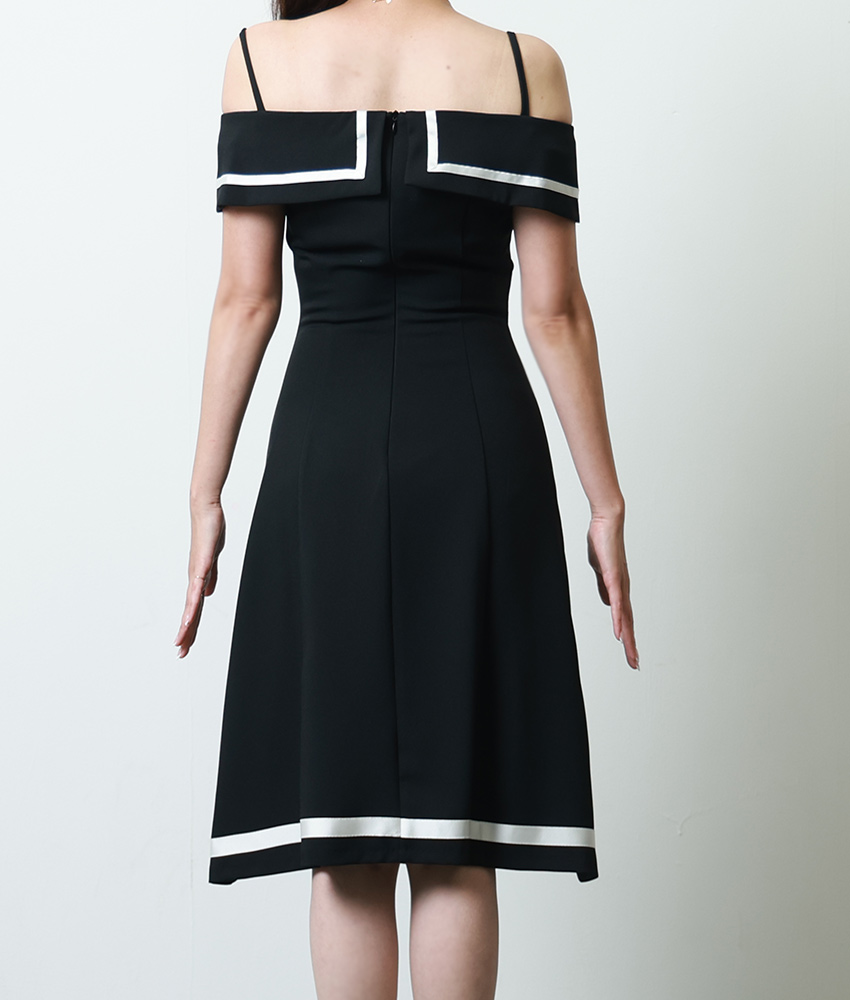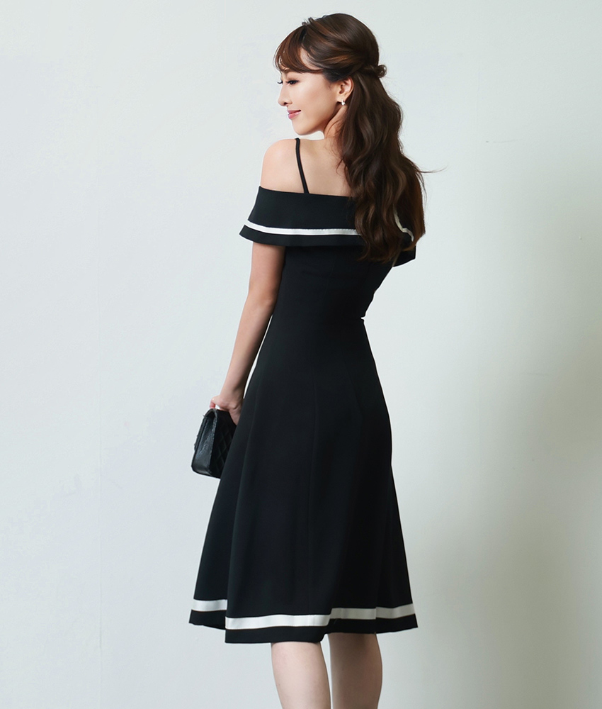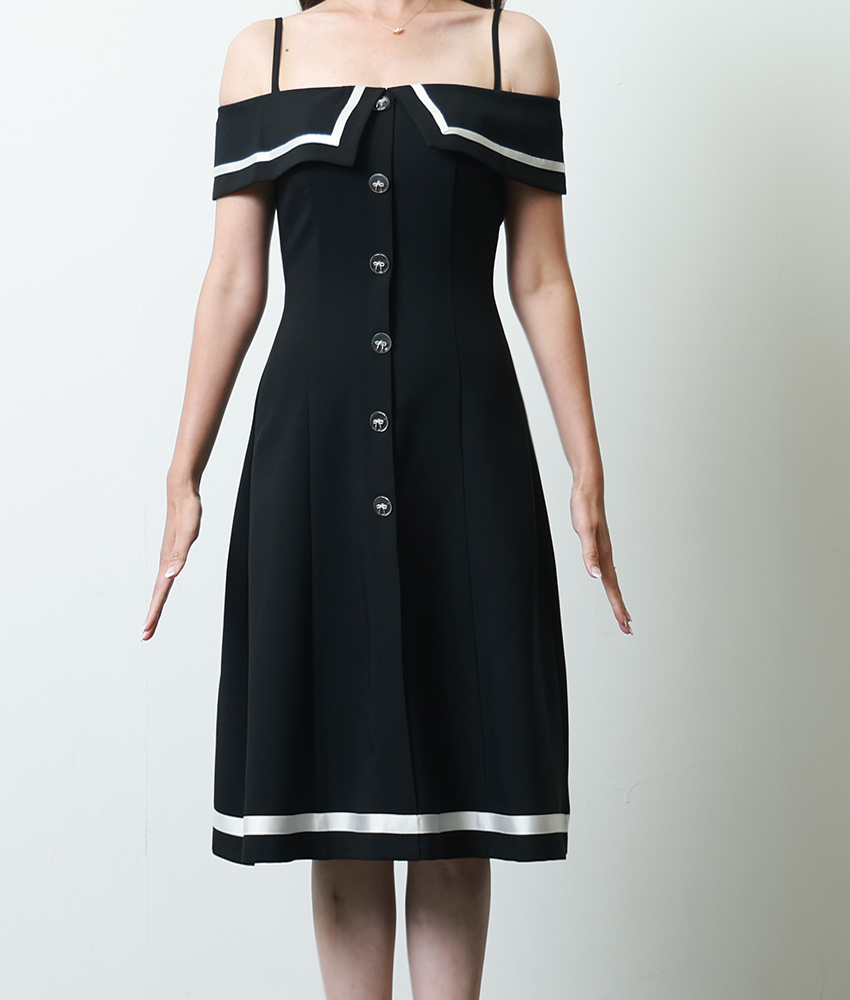 [韓国製][rinfarre] ブラック・ベージュ・オープンショルダー・オフショルダー・プリーツ・Aライン・ミディアムドレス・ワンピース[薗田杏奈着用][送料無料] [cd-k06186rd]