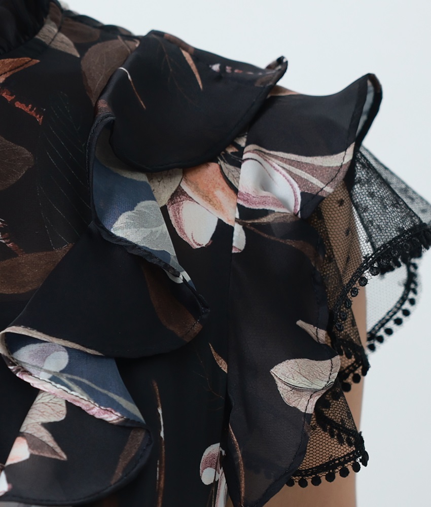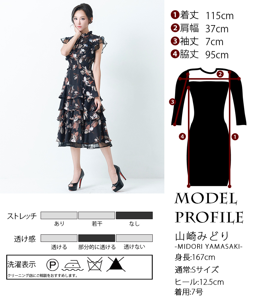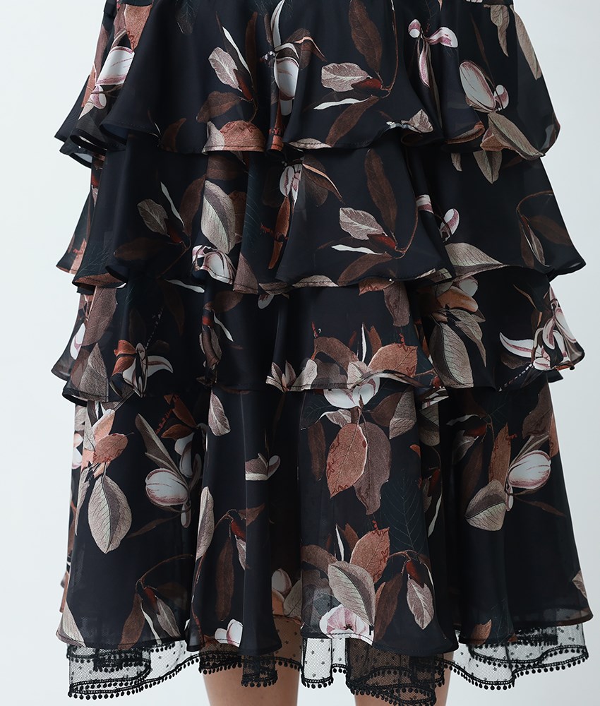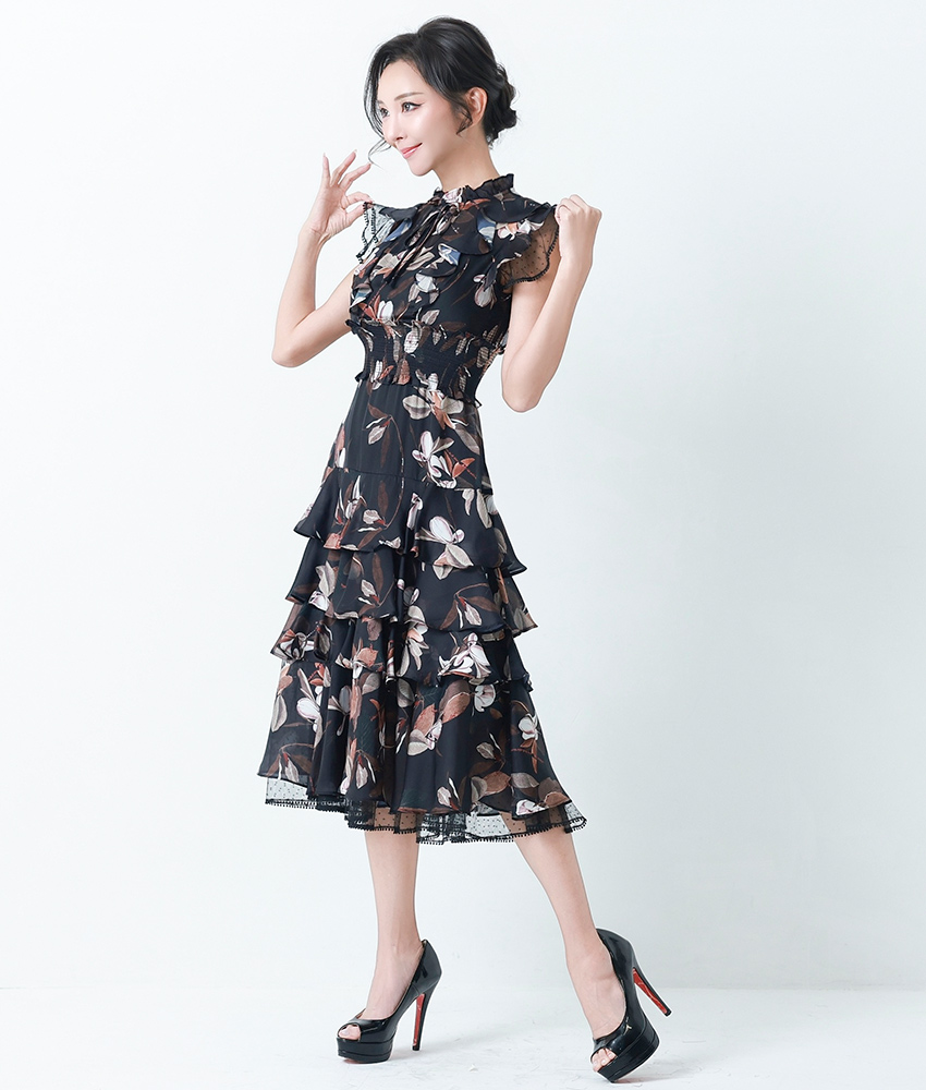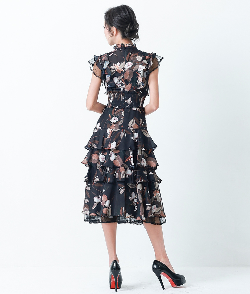 [ERUKEI]花柄・シフォン・ティアードフリル・Aライン・レースポイント・ミディアムドレス・ワンピース[黒木麗奈着用][送料無料] [lk-s101208]