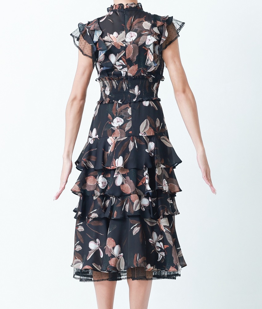 [ERUKEI]花柄・カラフル・ティアードフリル・シフォン・プチハイネック・マキシワンピ・ミディアムワンピース・ドレス[山崎みどり・薗田杏奈着用]《送料&代引き手数料無料》mywh [lk-l1208c]