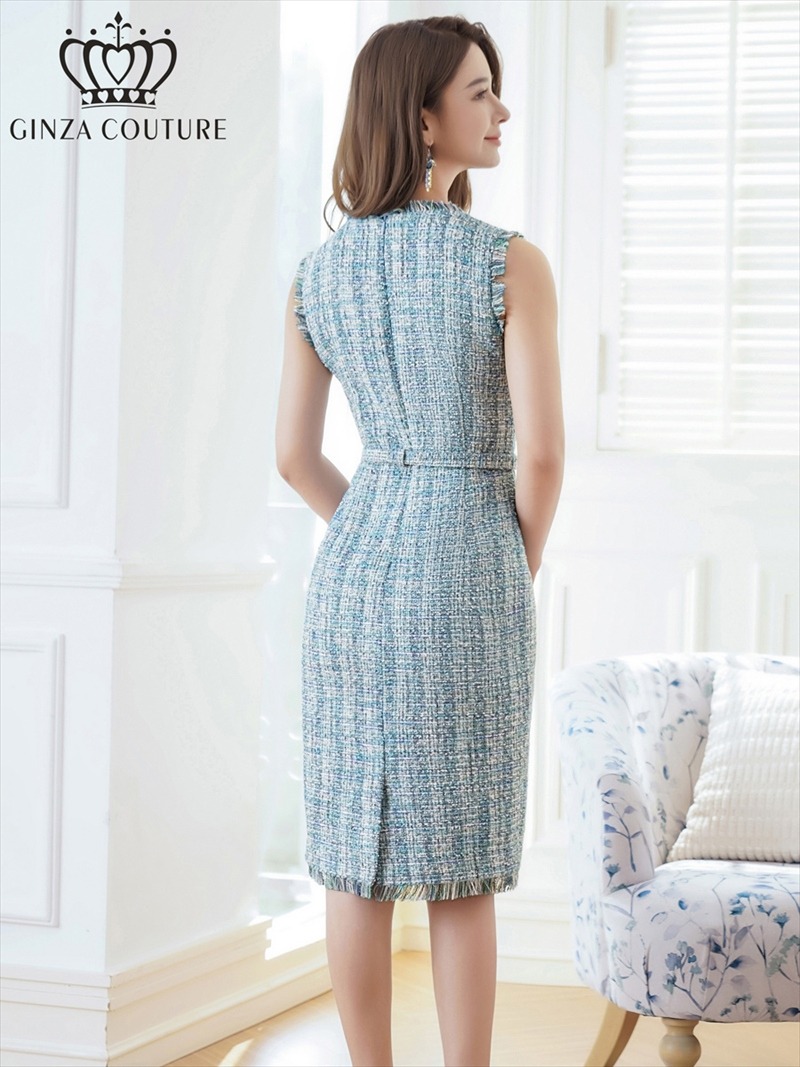 [ERUKEI/GINZA COUTURE]パープル・ブルー・ツイード・フリンジ・ノースリーブ・ベルト・タイト・膝丈・ミディアムドレス・ワンピース[送料無料] [lk-c2799]