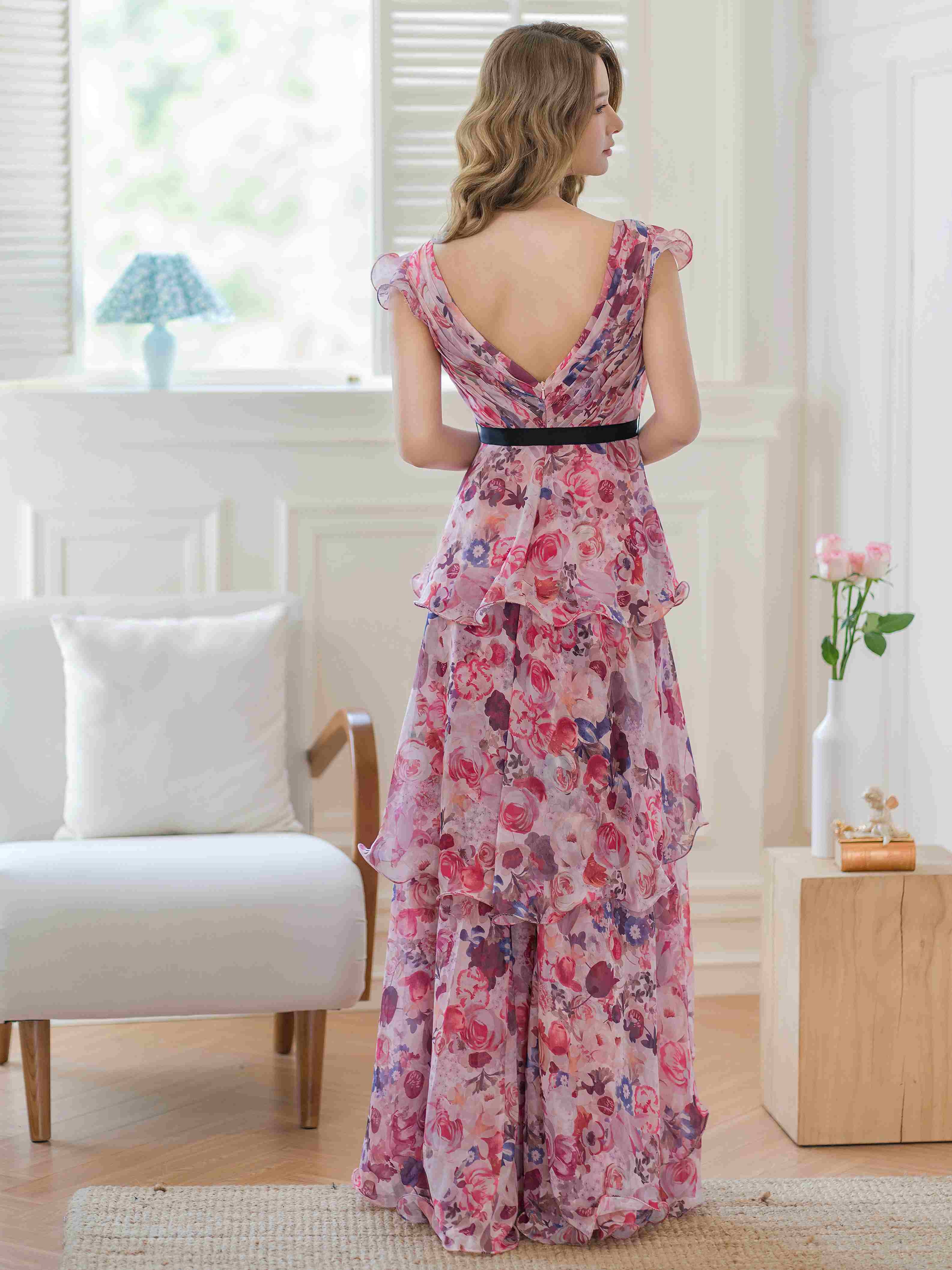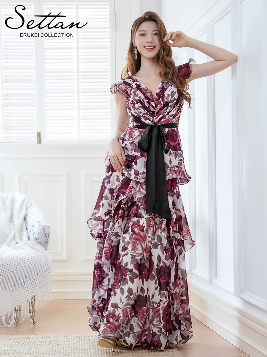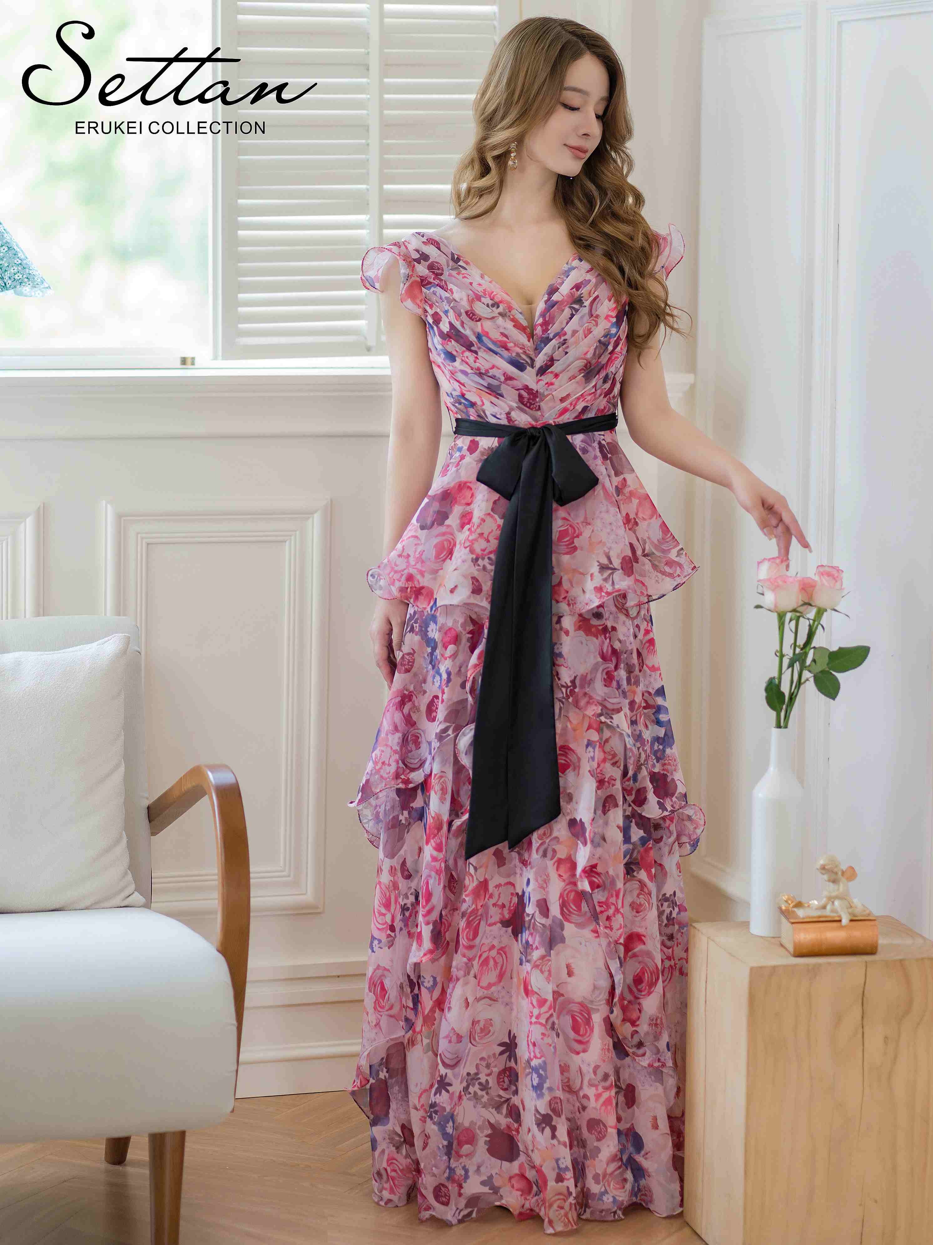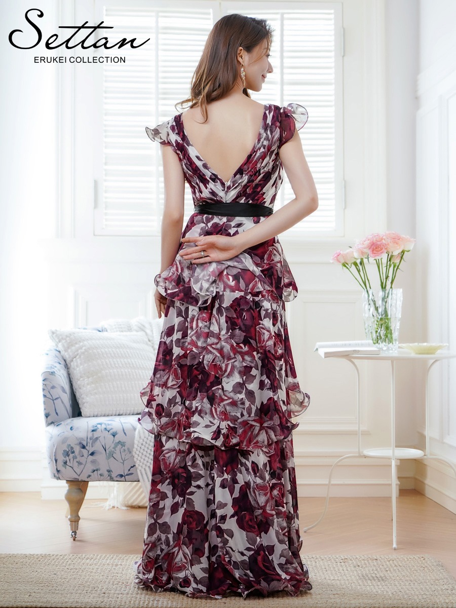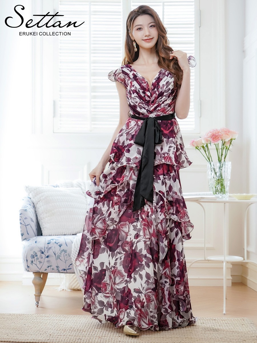 [ERUKEI/SETTAN]ベージュ×ピンク・ホワイト×ワインレッド・フラワープリント・ティアード・フリル・キュート・ロングドレス[送料無料] [lk-s36110]