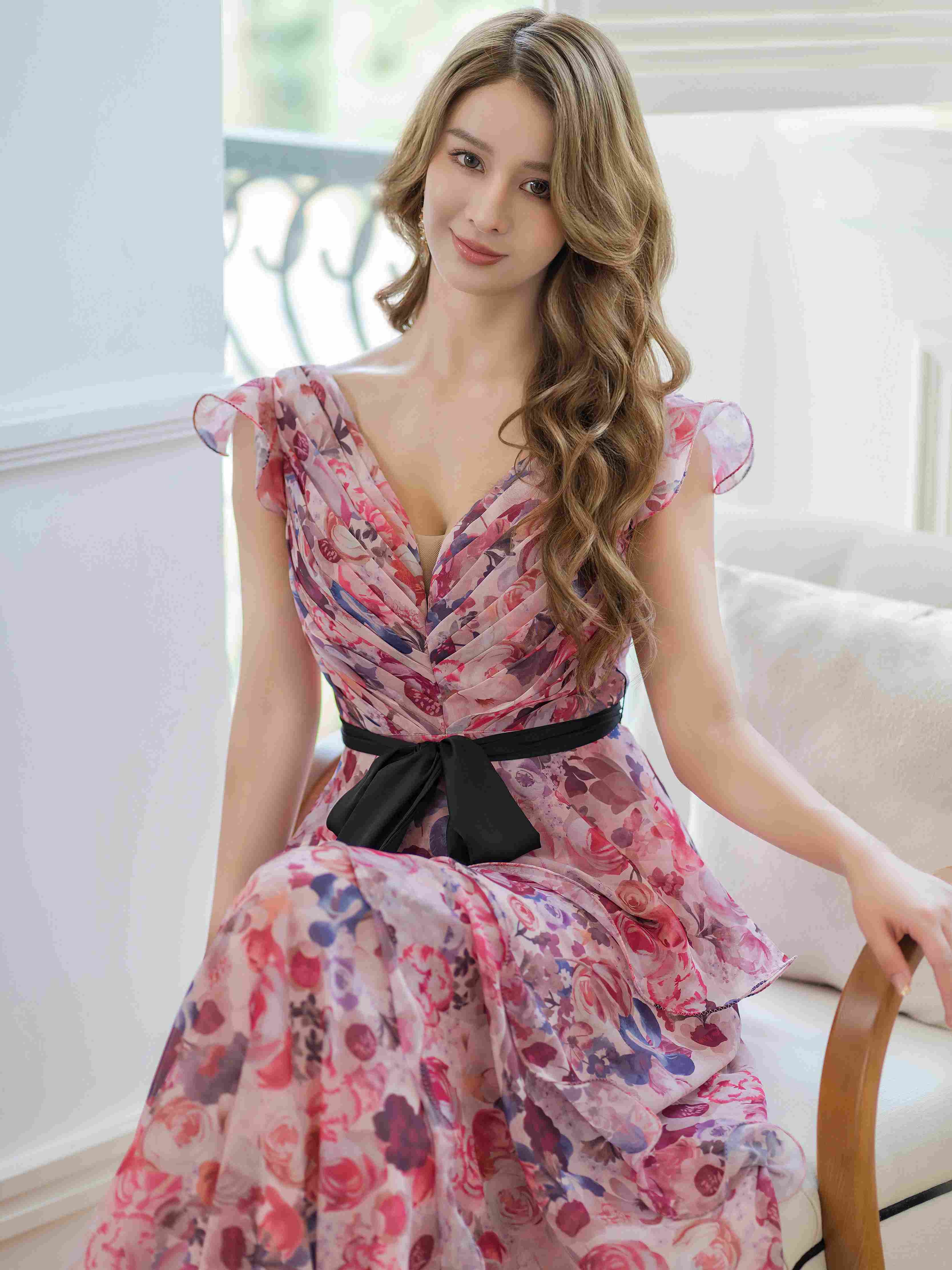 [ERUKEI]ブラック×ピンク・ドットフラワープリント・切替デザイン・Vネック・ノースリーブ・Aライン・ロングドレス[送料無料] [lk-e33514]