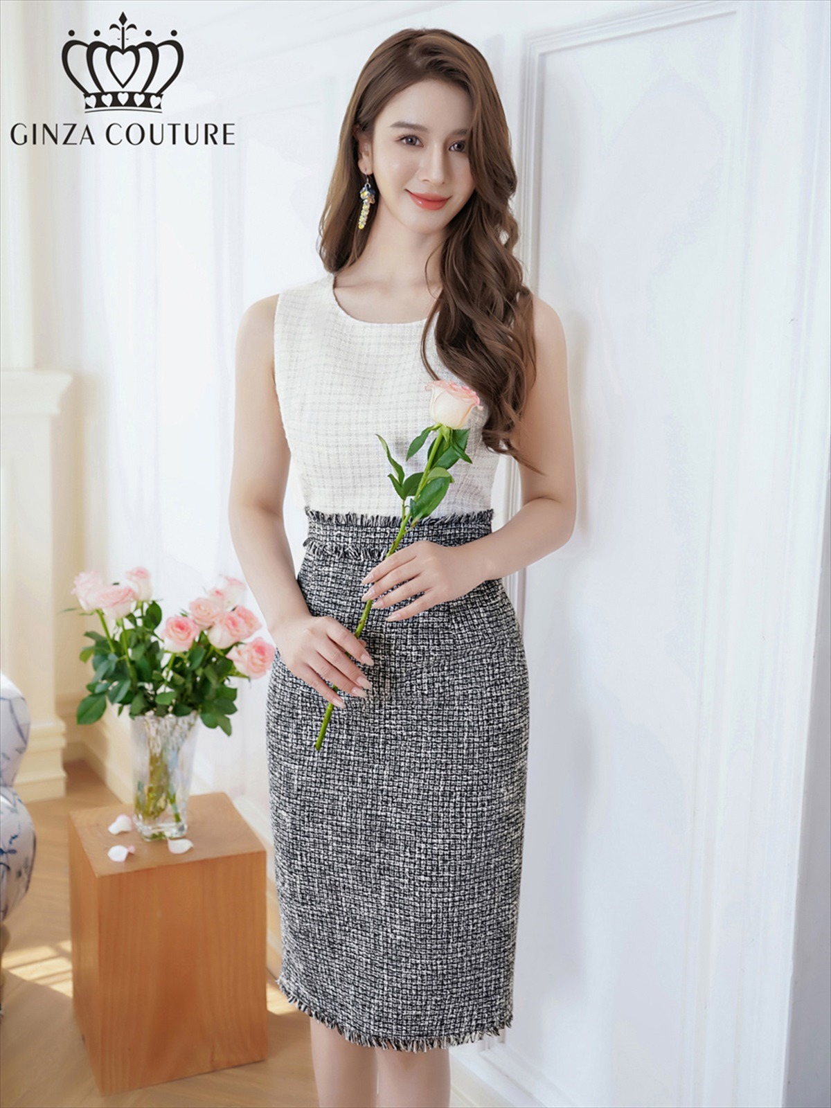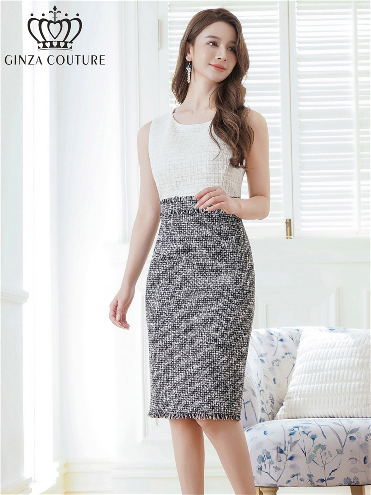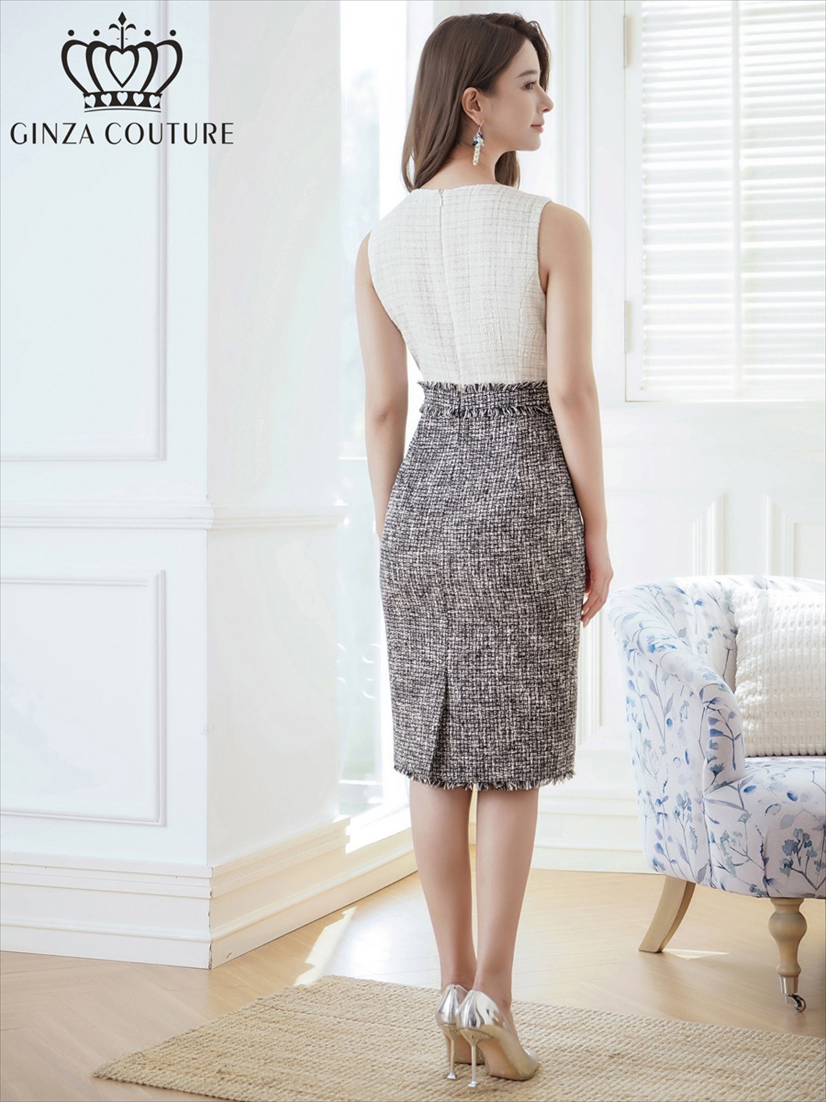 [ERUKEI/GINZA COUTURE]ホワイトxブラック・ツイード・タイト・ノースリーブ・ミディアムドレス・ワンピース[送料無料] [lk-c2800]