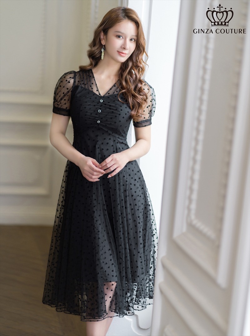 [ERUKEI/GINZA COUTURE]ブラック・半袖・ハート・ドット・Aライン・ミディアムドレス・ワンピース[送料無料] [lk-C24088]