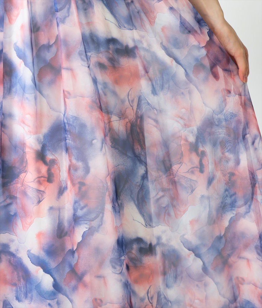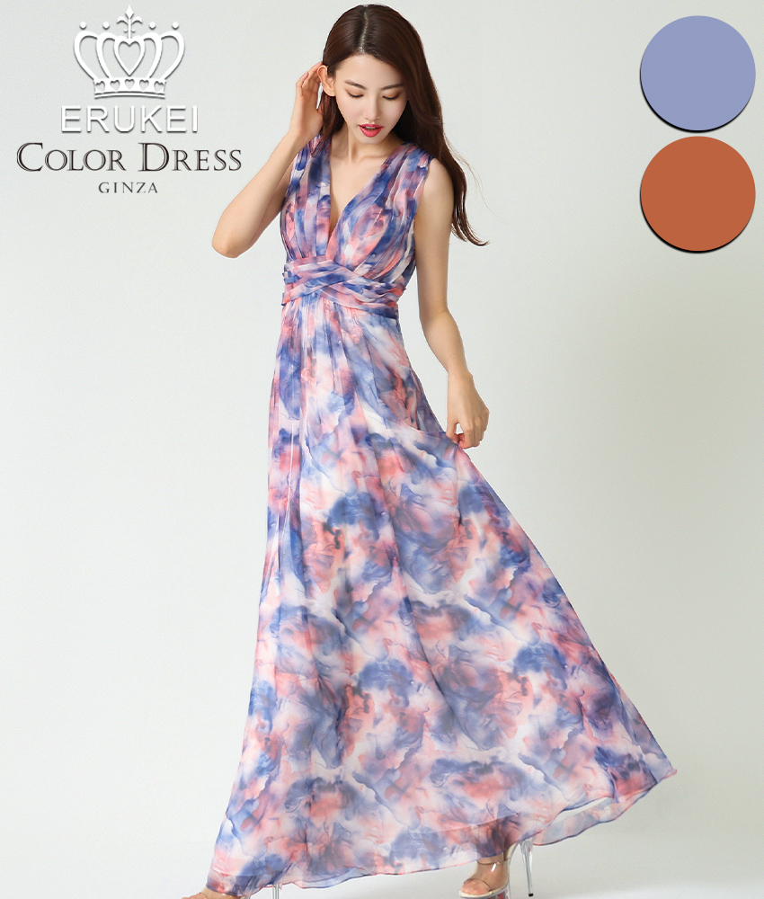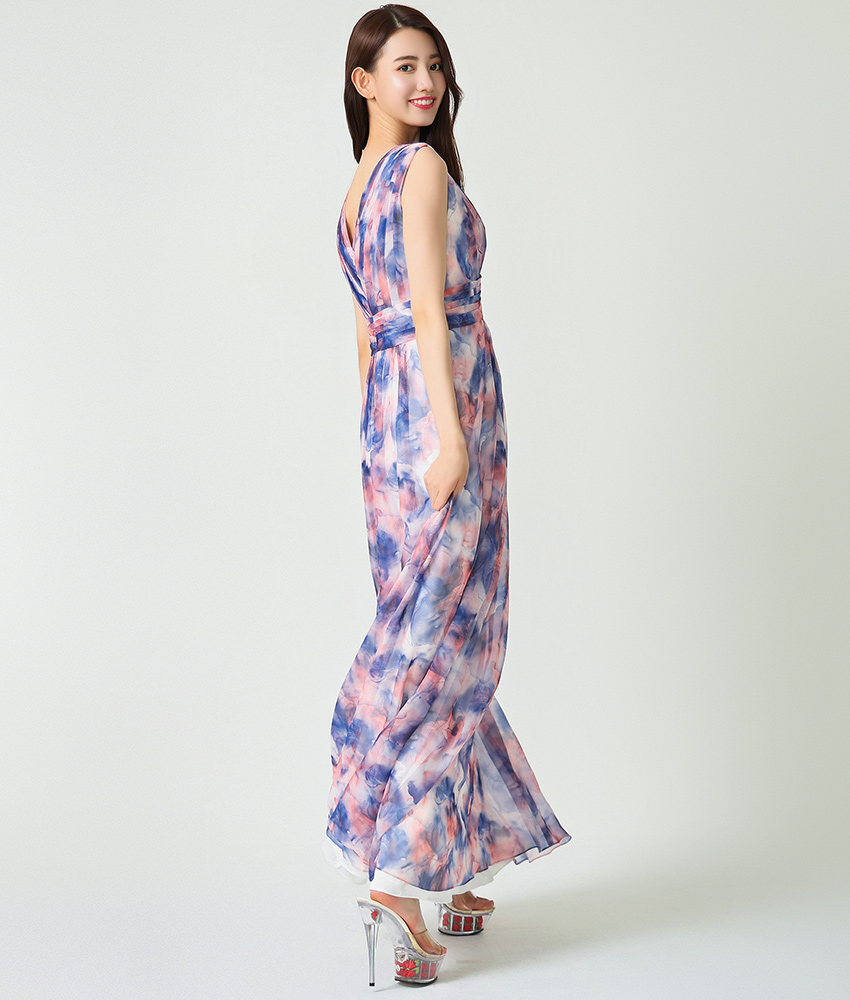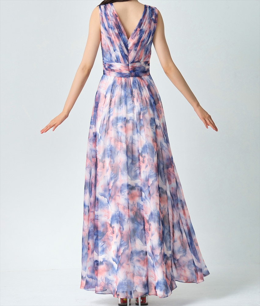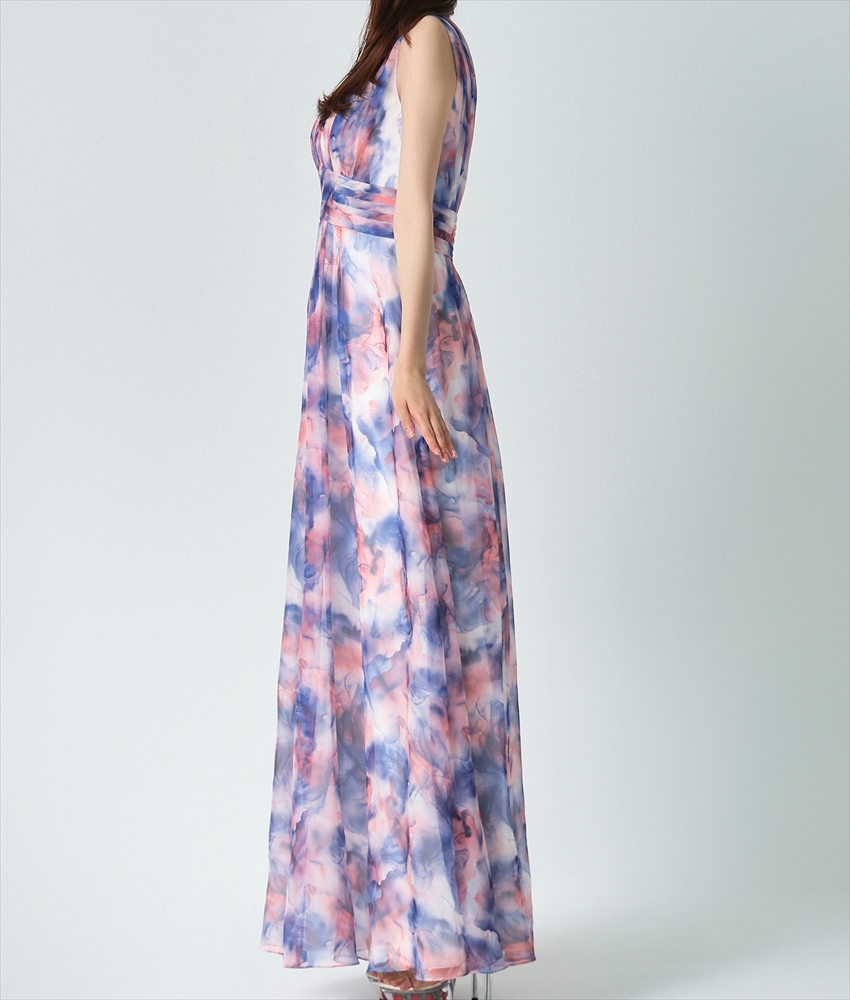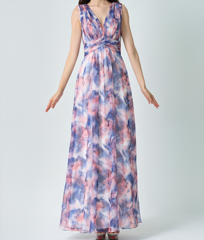 [ERUKEI]シフォン・滲み・プリント・ギャザー・Vネック・ノースリーブ・Aライン・ロングドレス《送料&代引き手数料無料》 [lk-s37908]