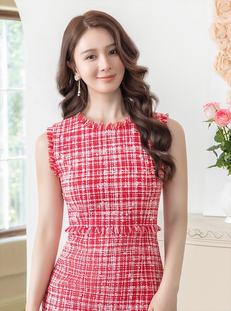 [ERUKEI]レッド・タイト・ノースリーブ・ツイード・フリンジ・ミディアムドレス・ワンピース[送料無料]