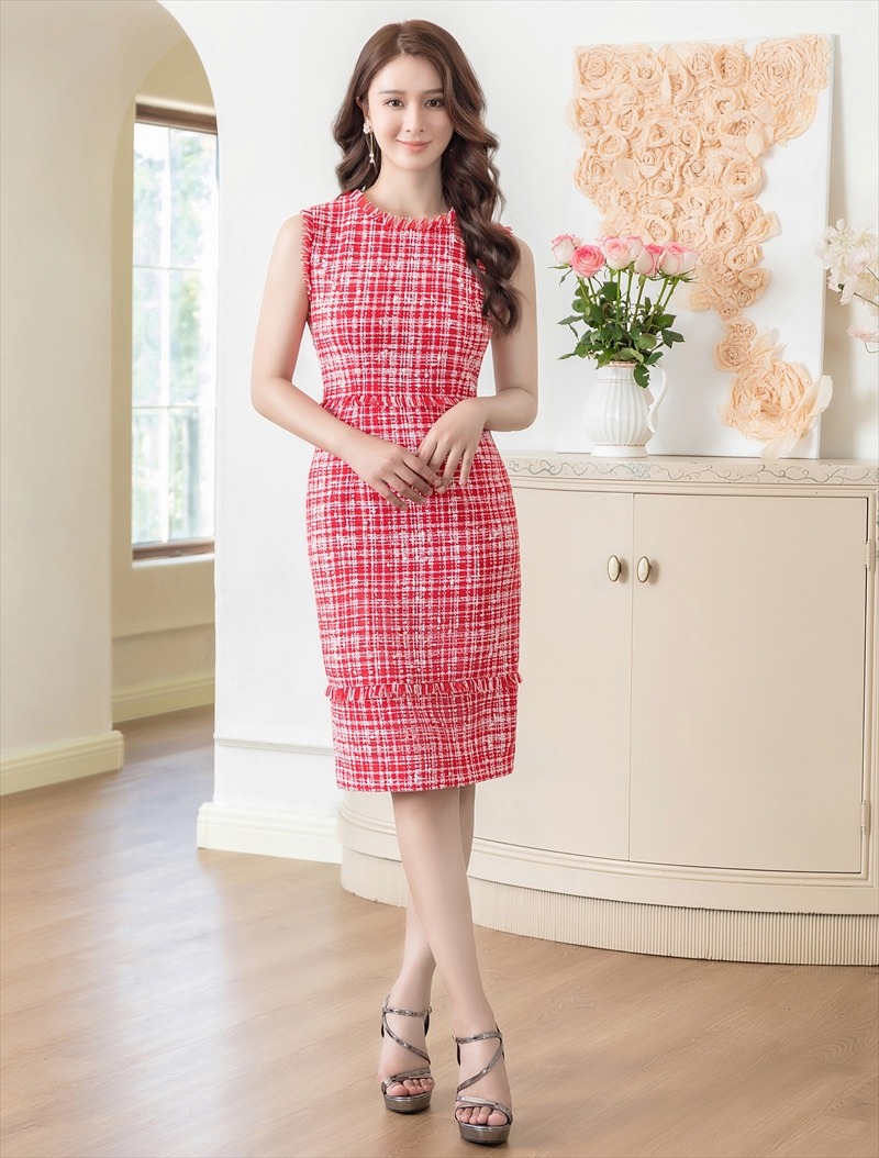 [ERUKEI]レッド・タイト・ノースリーブ・ツイード・フリンジ・ミディアムドレス・ワンピース[送料無料] [lk-e2628]
