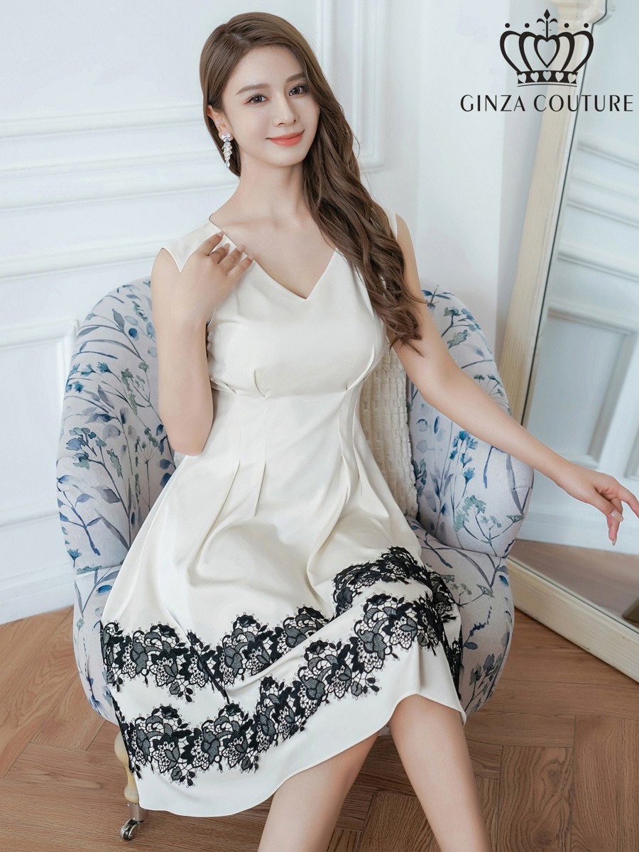 [ERUKEI/GINZA COUTURE]ノースリーブ・Vネック・タック・サテン・裾レース・Aライン・ミディアムドレス・ワンピース[送料無料] [lk-c24042]