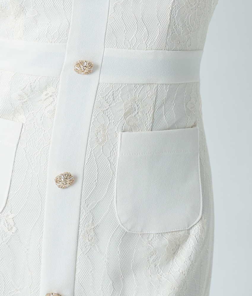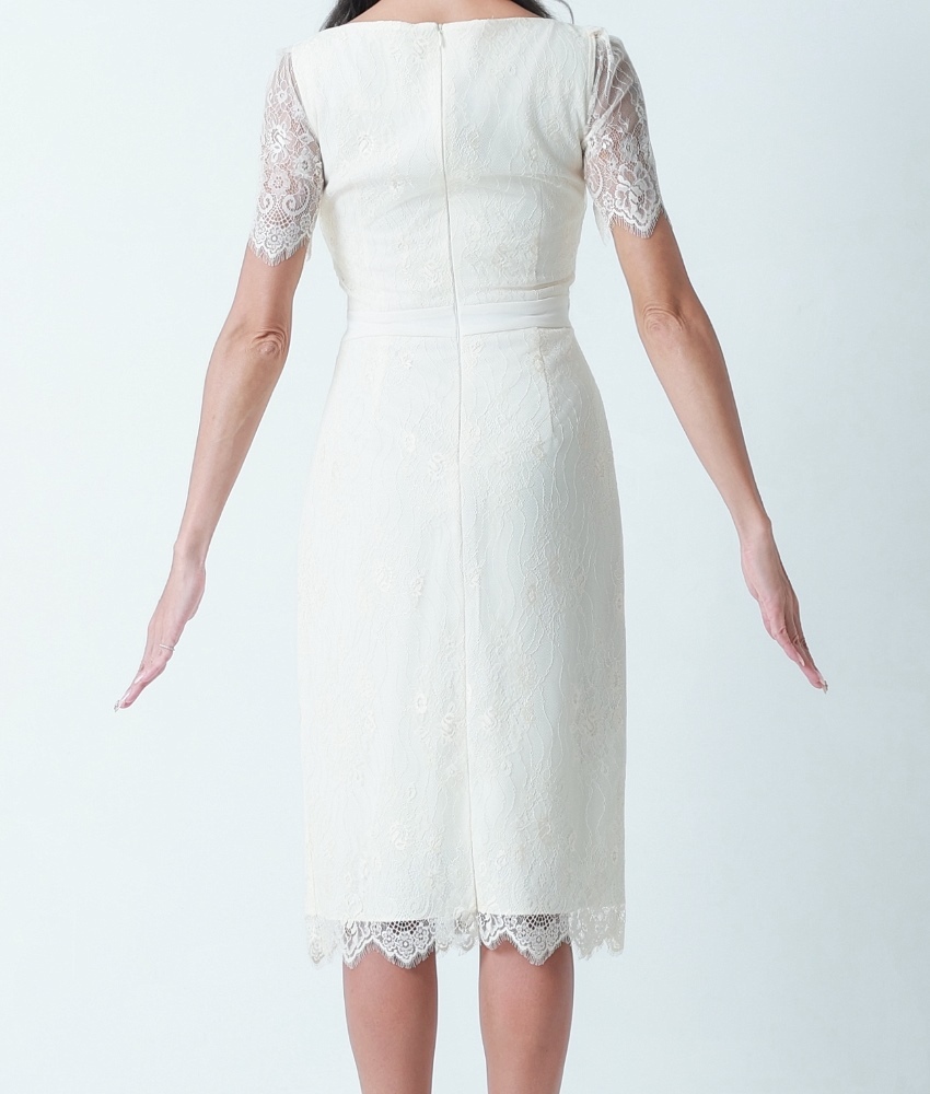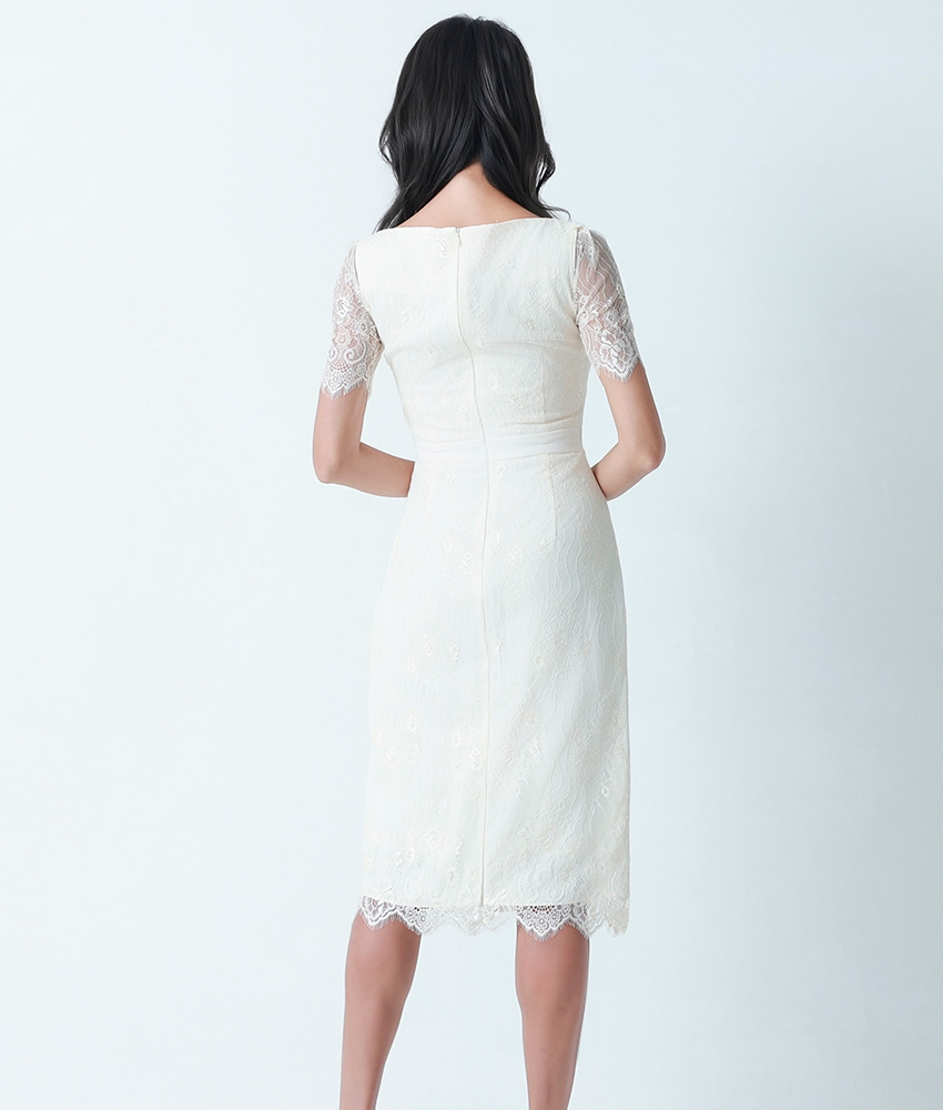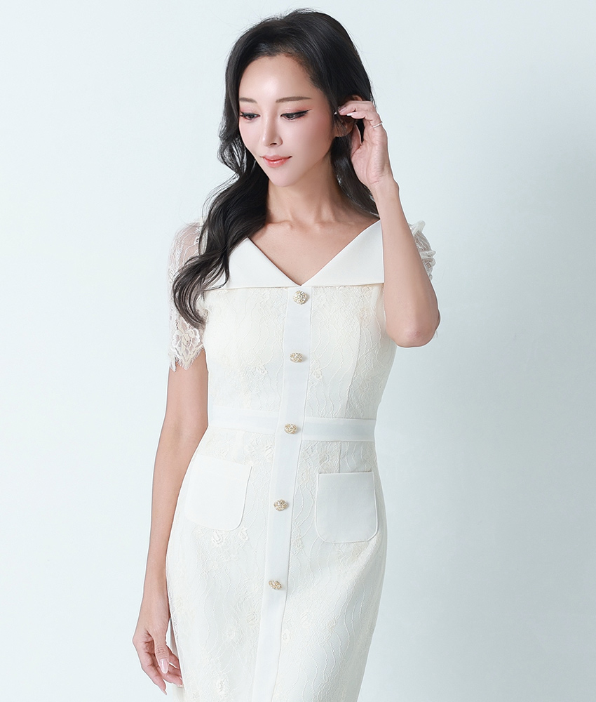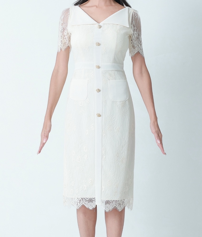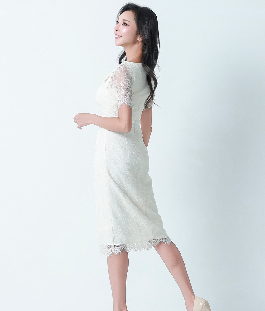 [韓国製][rinfarre]アイボリー・総レース・襟付き・半袖・ボタン・タイト・ミディアムドレス・ワンピース myiv[山崎みどりちゃん着用][送料無料] [cd-k06211y]