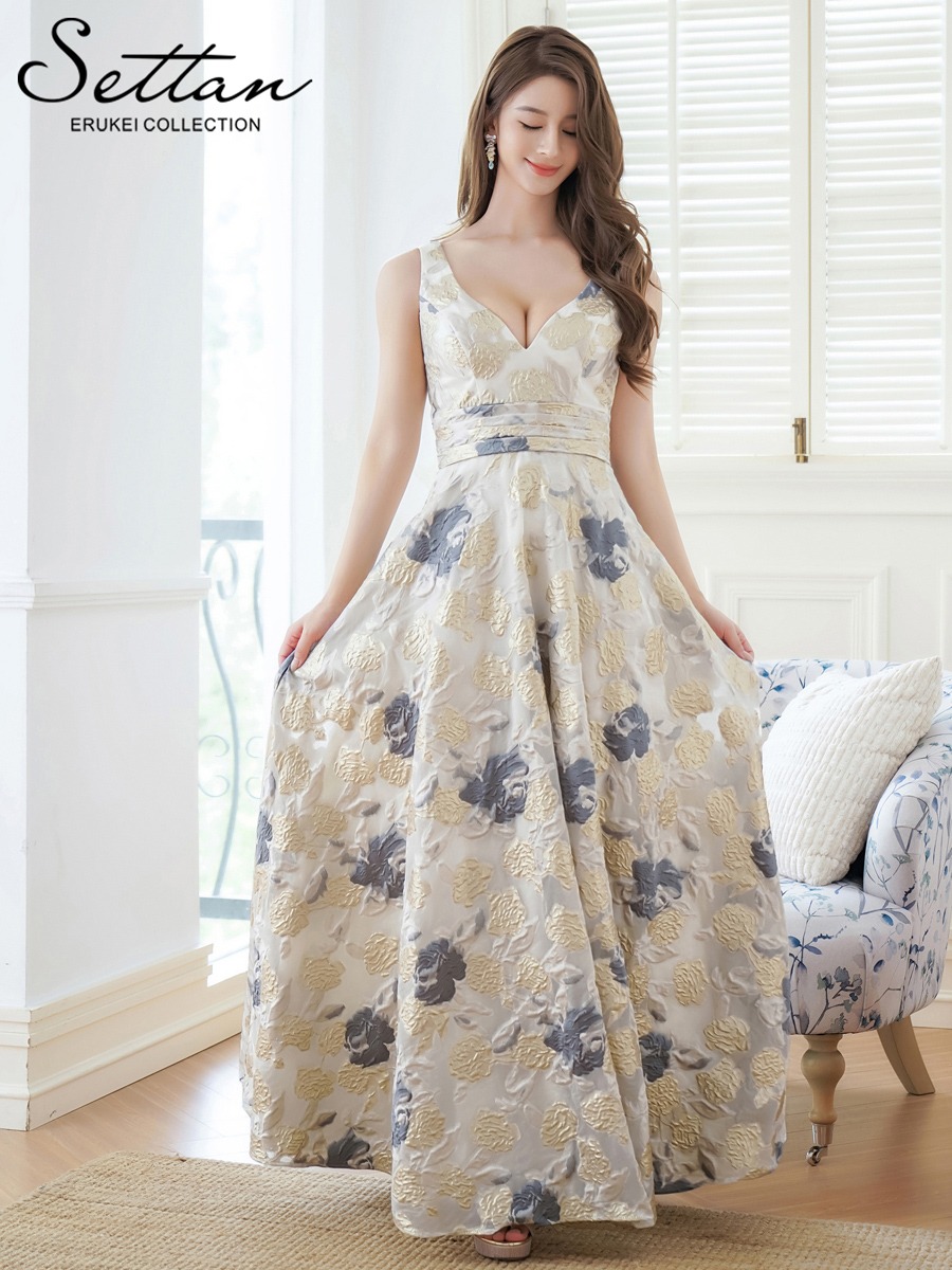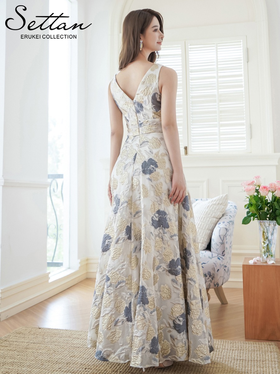 [ERUKEI/SETTAN]ゴールド×グレー・ノースリーブ・Vネック・花柄・フレア・フラワー・Aライン・ロングドレス[送料無料] [lk-s36503]