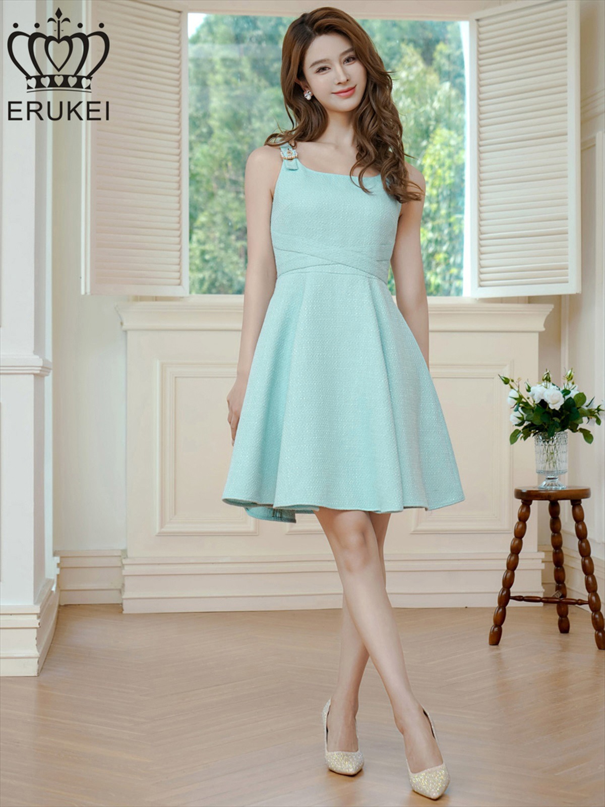 [ERUKEI]グリーン・ノースリーブ・ベルト風・ツイード・Aライン・ミニドレス・ワンピース[送料無料] [lk-e24208]