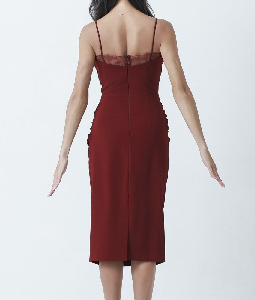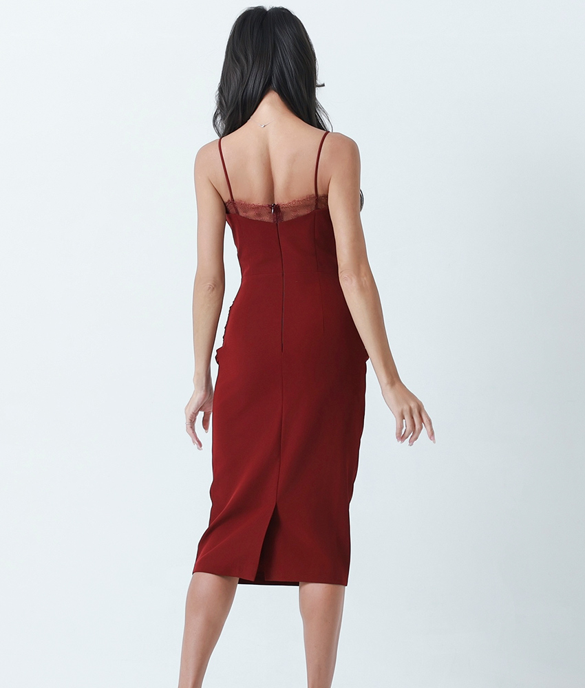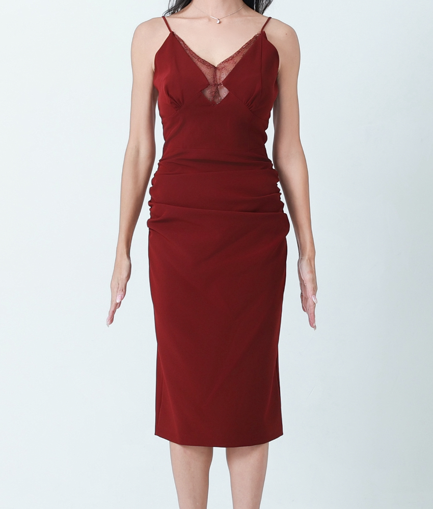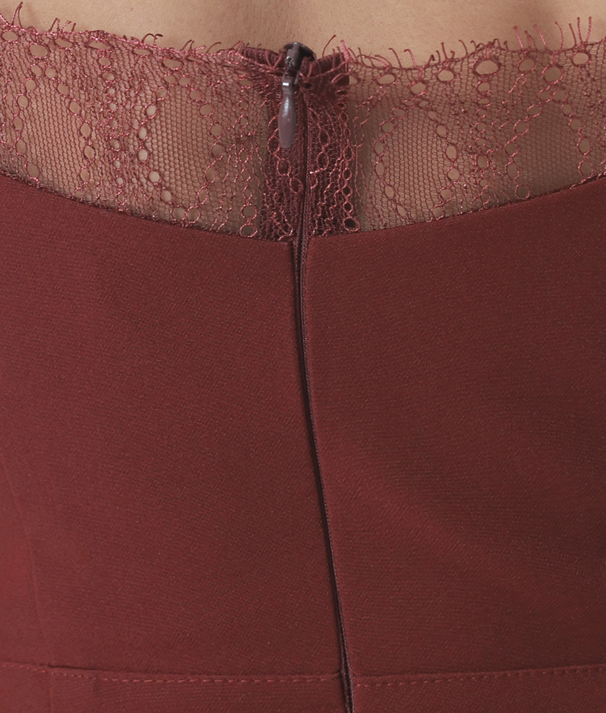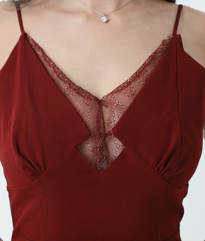[韓国製][rinfarre]バーガンディー・キャミ紐・部分レース・タイトシルエット・ミディアムドレス[山崎みどりちゃん着用][送料無料] [cd-k06213t]