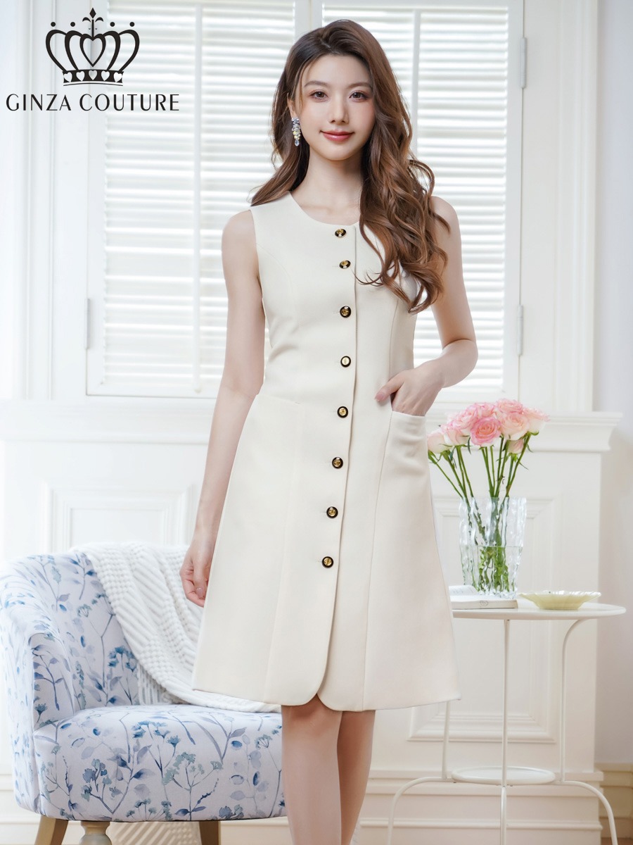 [ERUKEI/GINZA COUTURE]アイボリー・ノースリーブ・ハニカム生地・金ボタン・ポケット・ミディアムドレス・ワンピース[送料無料] [lk-c24185]