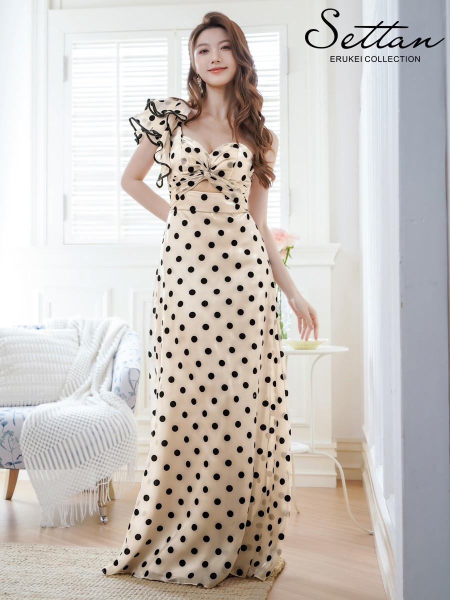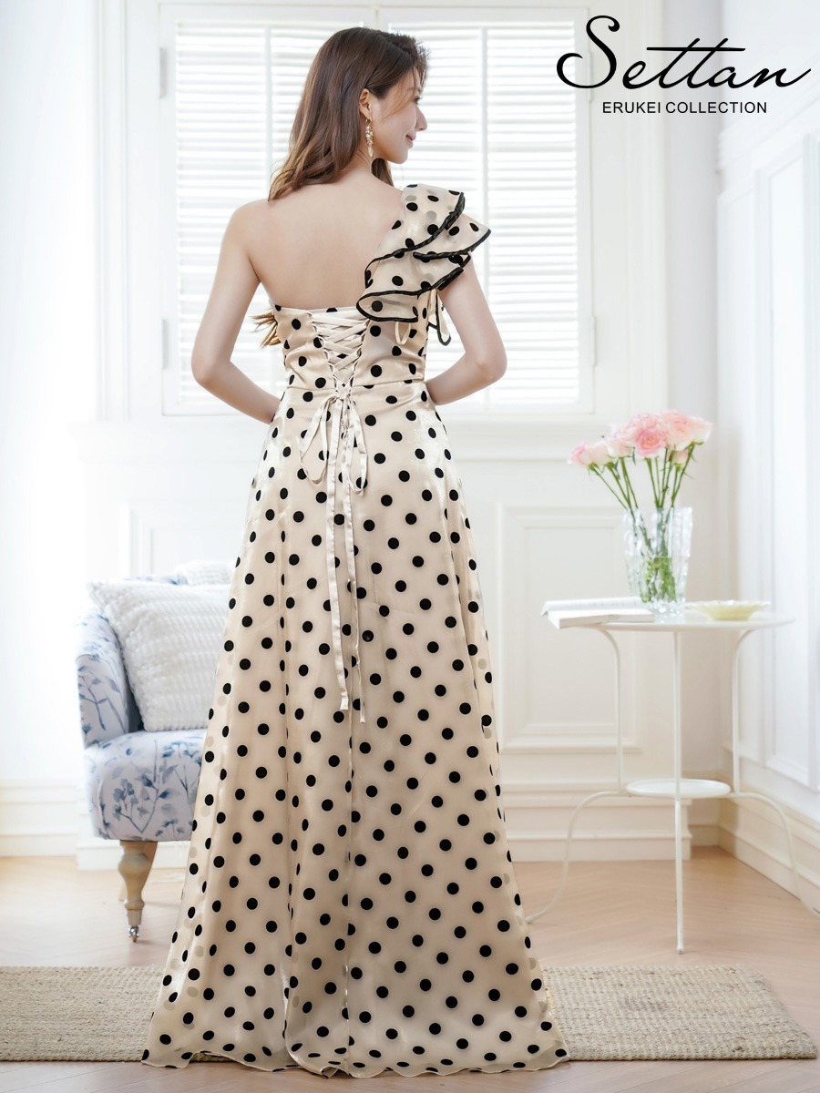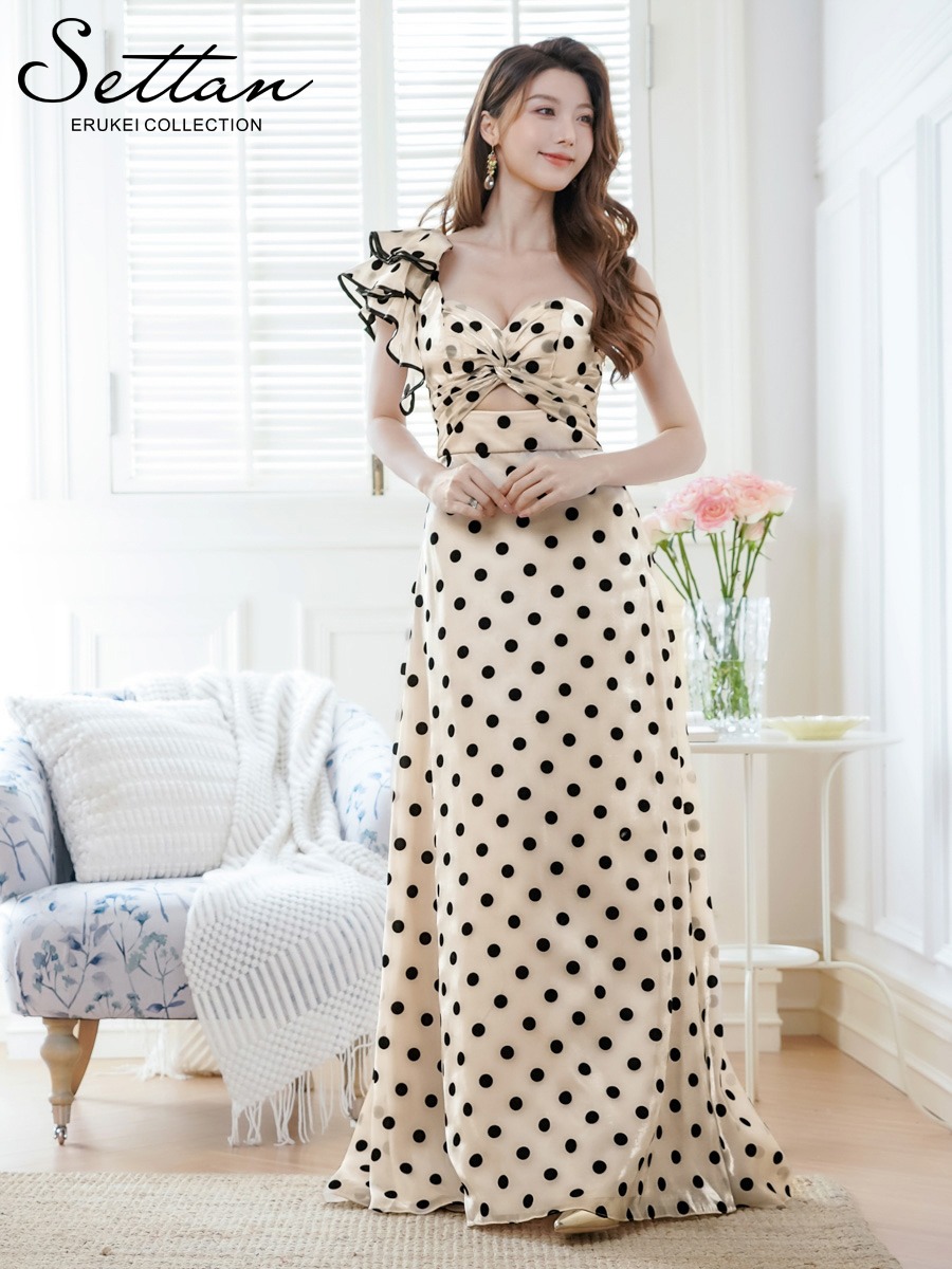 [ERUKEI/SETTAN]ベージュ×ブラック・ワンショルダー・フリル・カットアウト・スピンドル・シンプル・フリル・Aライン・ロングドレス[送料無料] [lk-s36201]