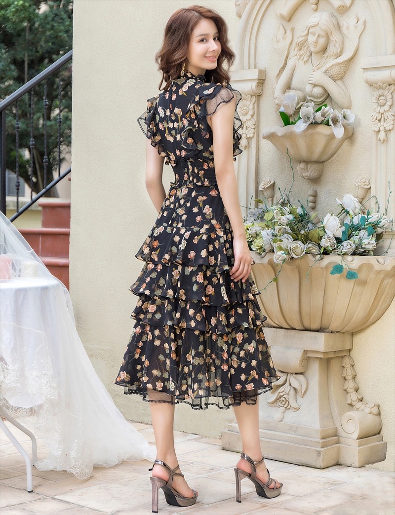 [ERUKEI/SETTAN]ブラック・フラワープリント・ティアード・フリル・ミディアムドレス・ワンピース[送料無料] [lk-s21208]