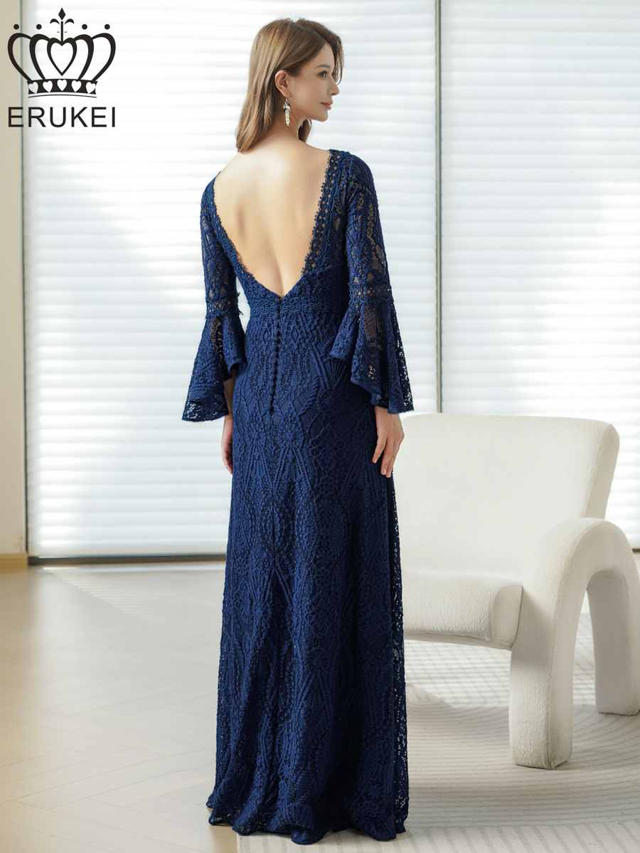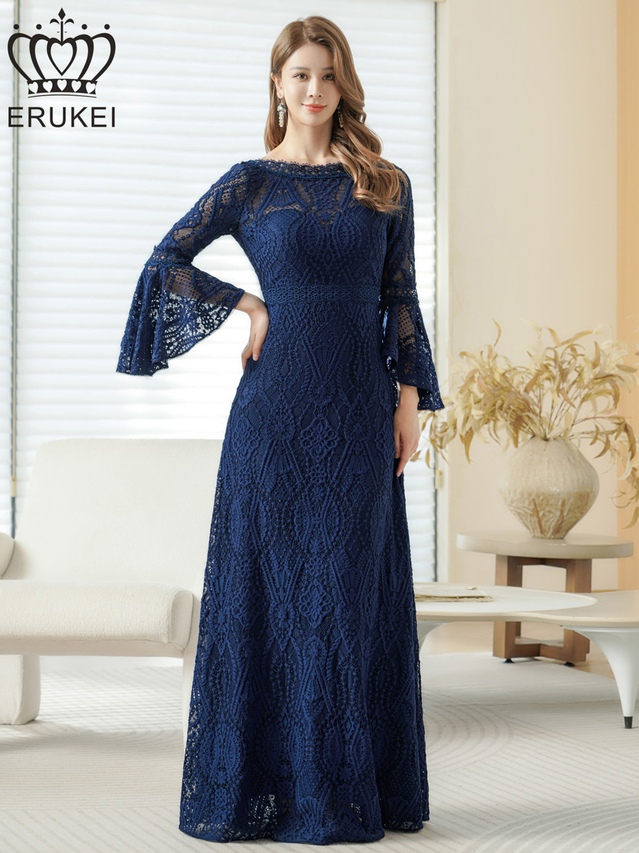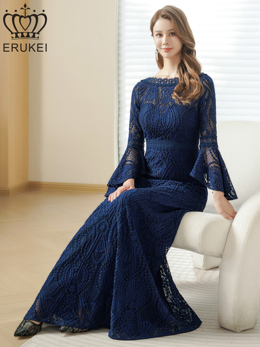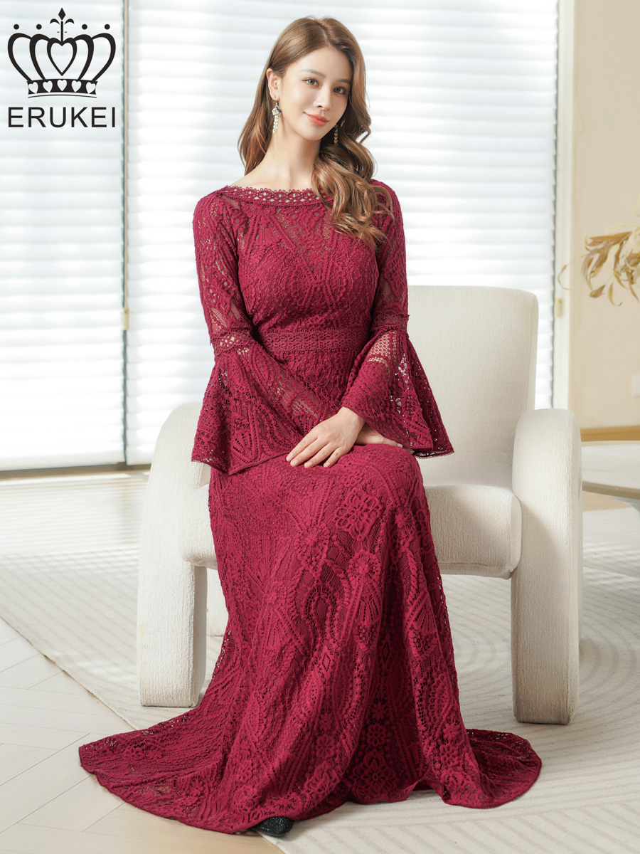 [ERUKEI] ホワイト・ワインレッド・ネイビー・レッド・総レース・ベルスリーブ・Aライン・エレガント・ロングドレス[山崎みどり着用][送料無料]mywh [lk-e24083]