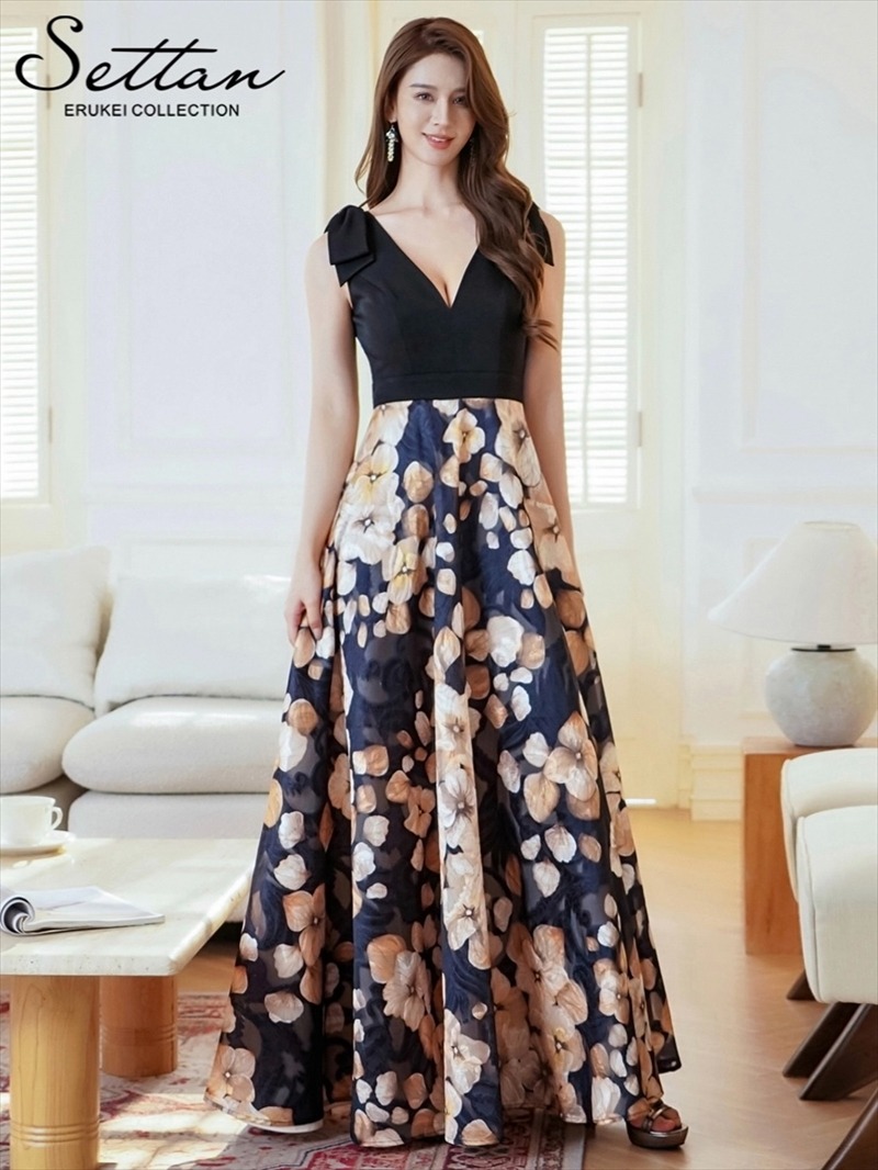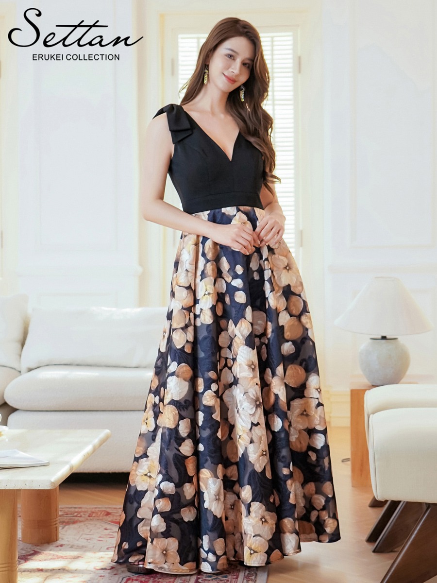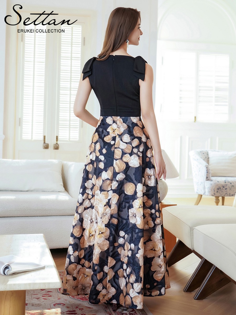[SETTAN]ブラック・グレー・花柄・Aライン・重厚感・ウエスト切り替えし・Vネック・ノースリーブ・ロングドレス・ワンピース[山崎みどり着用]《送料&代引き手数料無料》 mybk [lk-s36158]
