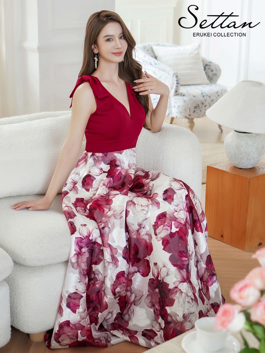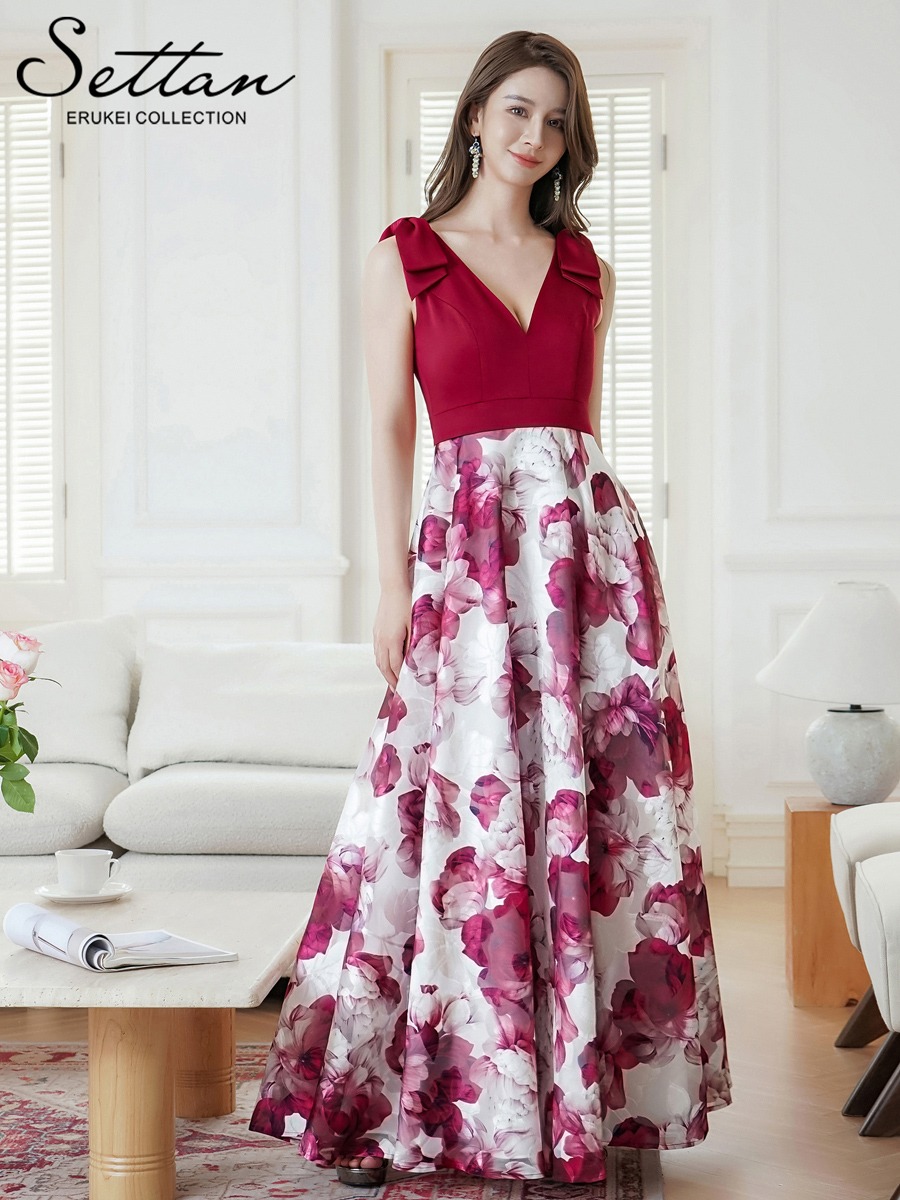 [ERUKEI SETTAN]パープル・レッド・フラワープリント・Vネック・Aライン・ロングドレス[黒木麗奈着用][送料無料] [lk-s36502]