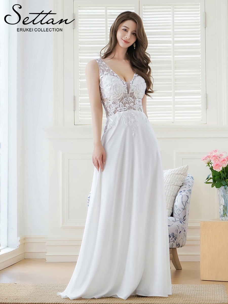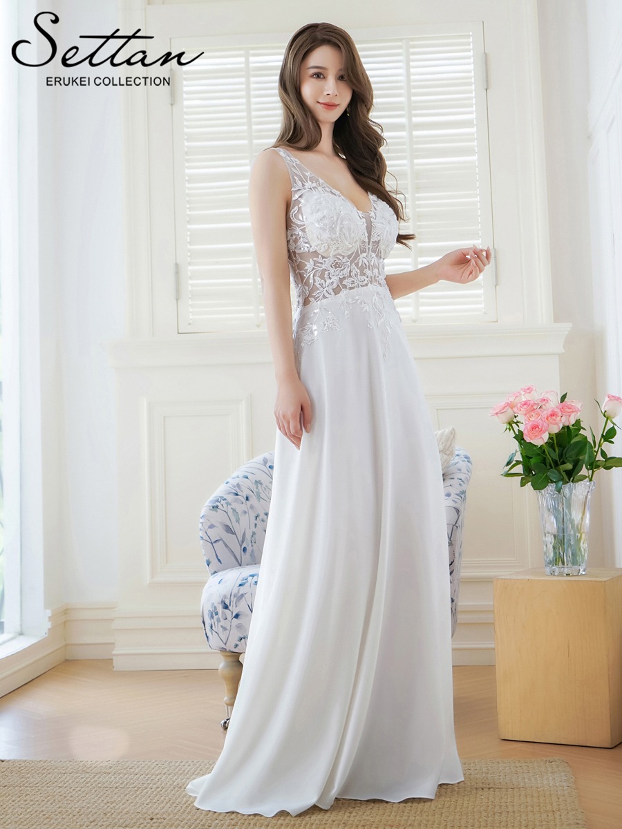 [ERUKEI/SETTAN]ホワイト・ネイビー・ベージュ・ワインレッド・Aライン・エレガント・胸元レース・スパンコール・ロングドレス[送料無料] [lk-s35107]