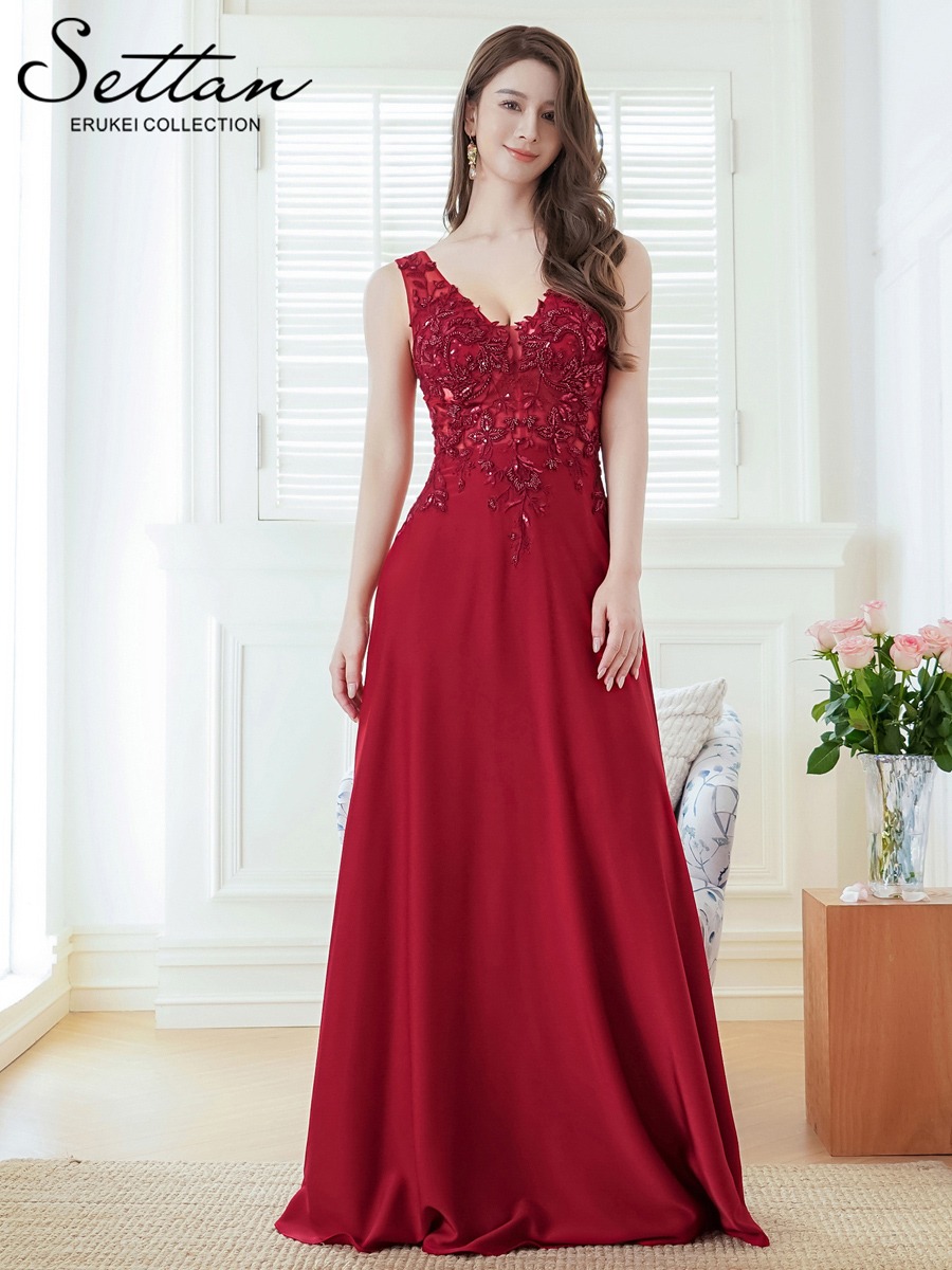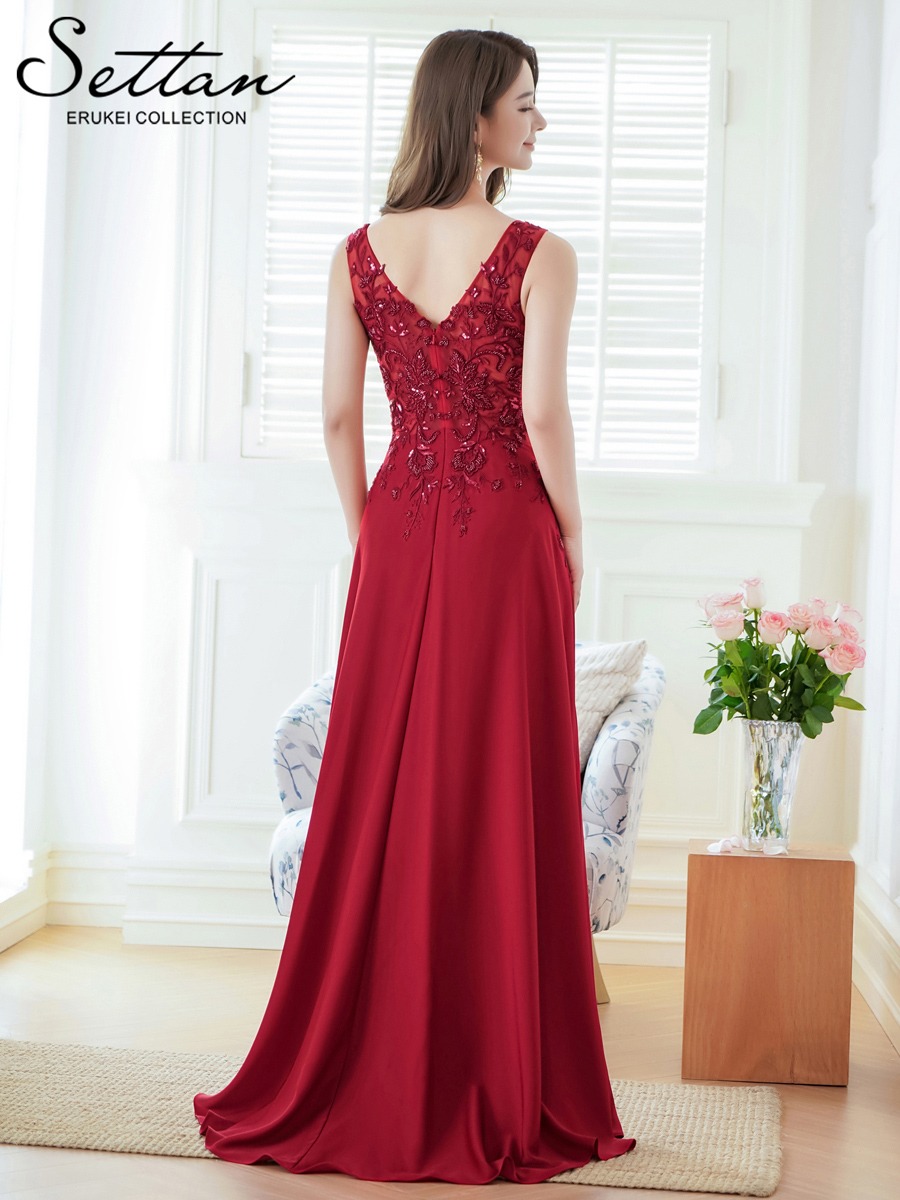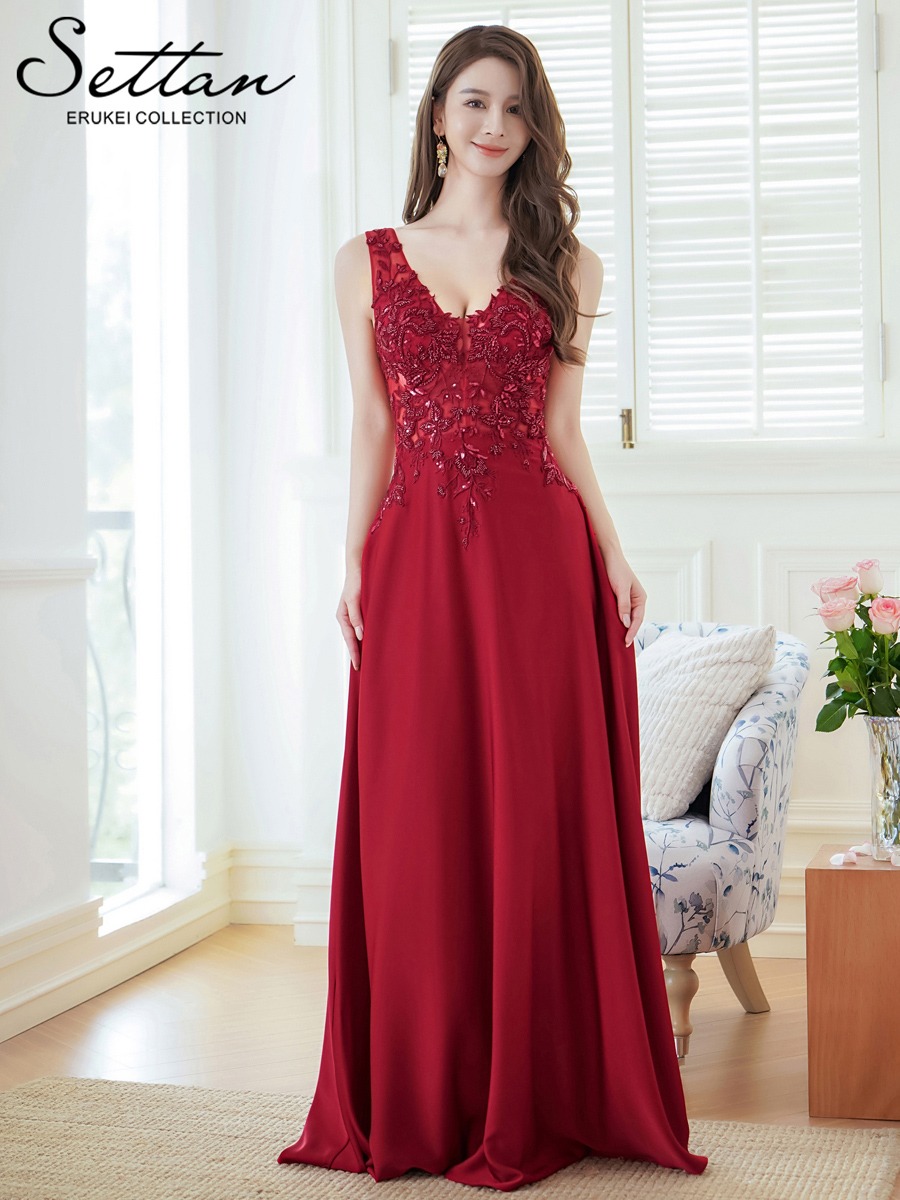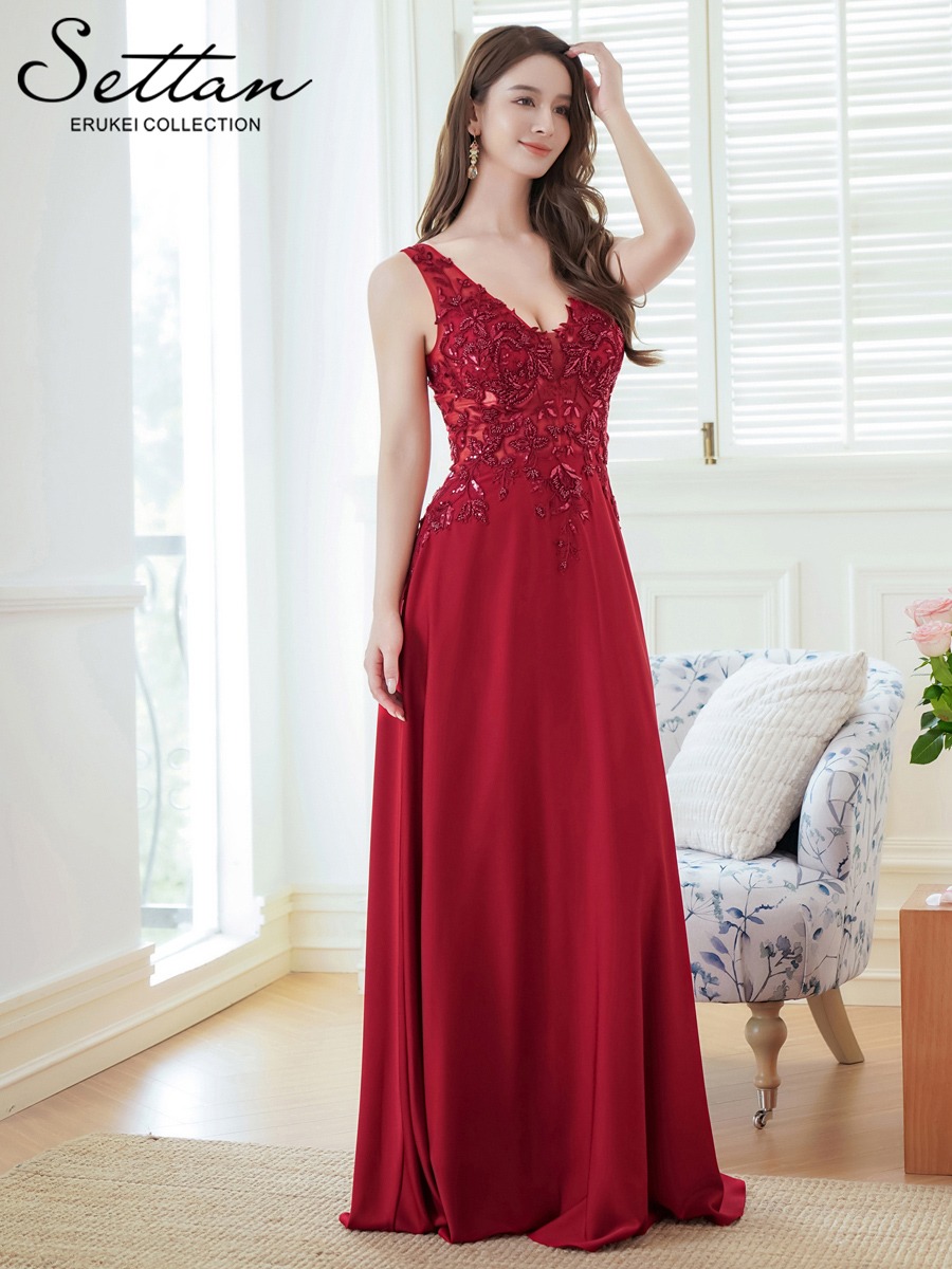 [ERUKEI/SETTAN]ワインレッド・ホワイト・Vネック・Aライン・エレガント・胸元レース・ビーズ・スパンコール・ロングドレス[送料無料] [lk-s36122]