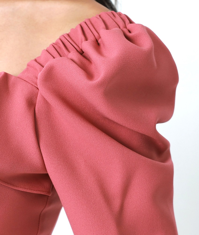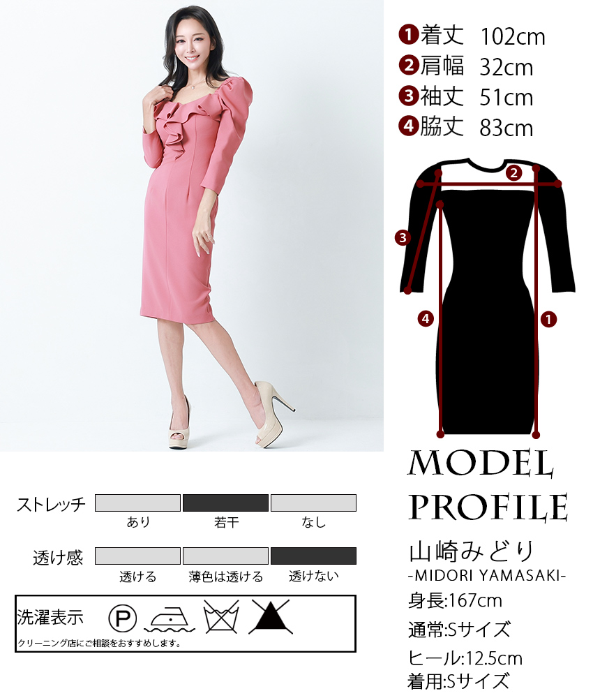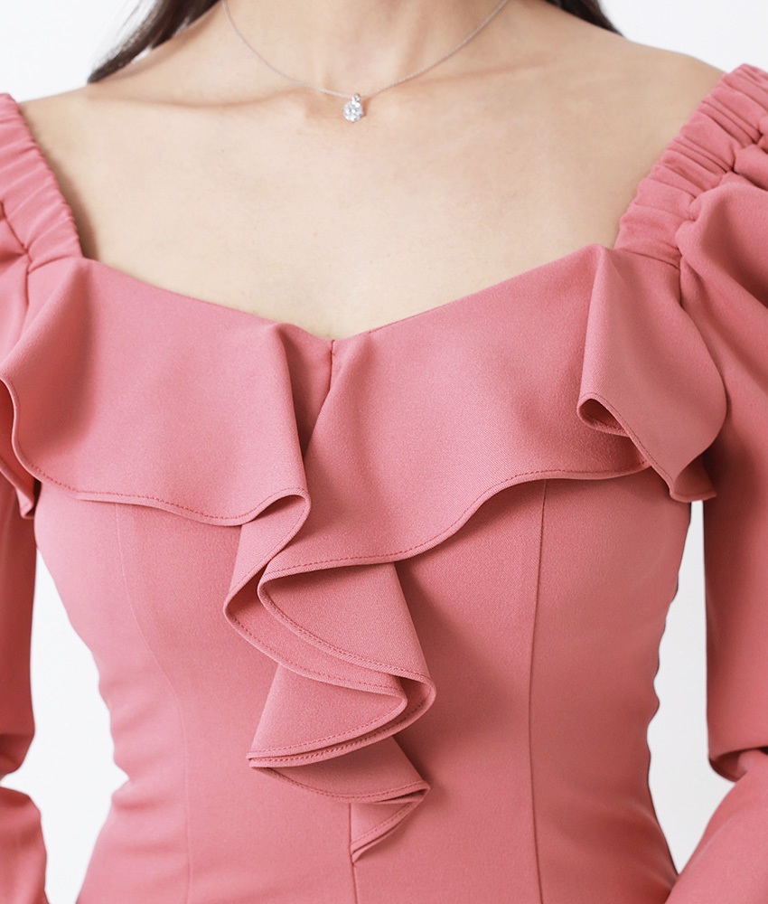 [韓国製][rinfarre]ローズピンク・フリル・パフスリーブ・九分袖・ラッフル・タイト・長袖・ミディアムドレス・ワンピース[山崎みどり着用][送料無料]mypk [cd-k06175rd]