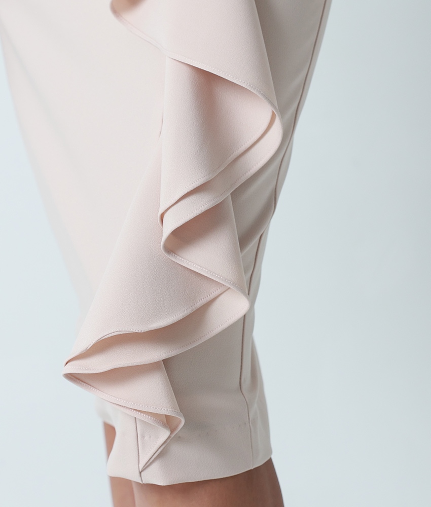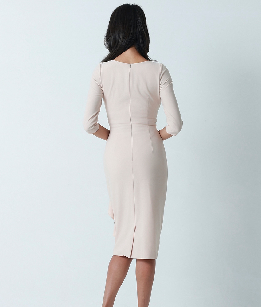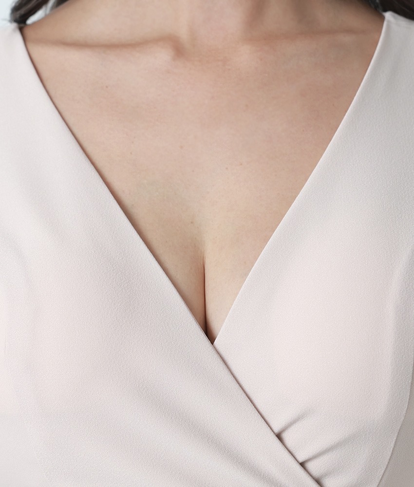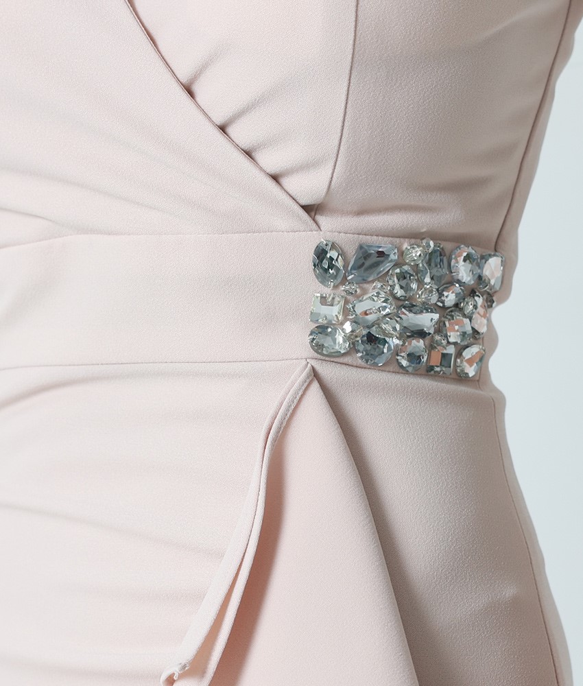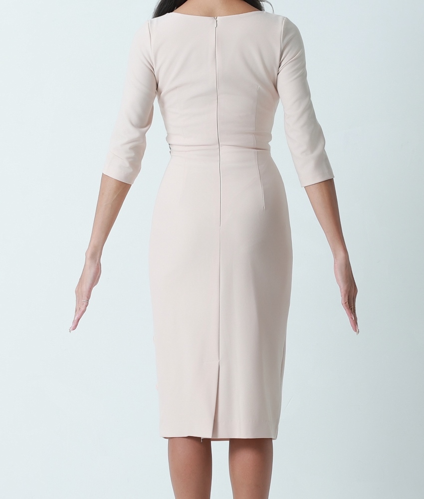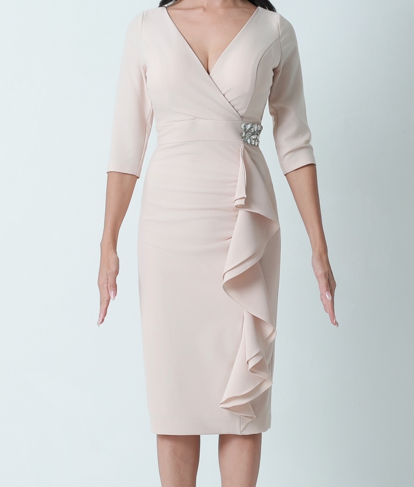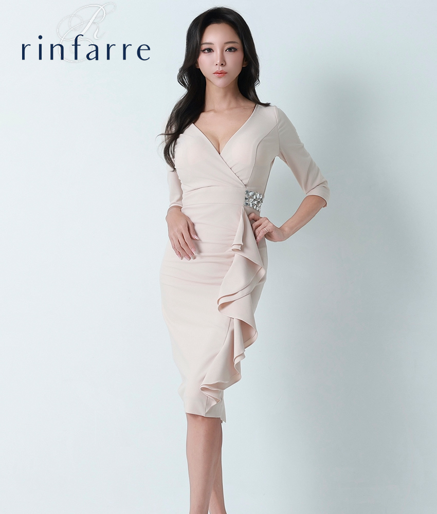 [韓国製][rinfarre]ベージュ・ビジュー・七分袖・フリル・Vネック・タイト・ミディアムドレス・ワンピース[山崎みどり着用][送料無料]myju [cd-k06215gr]