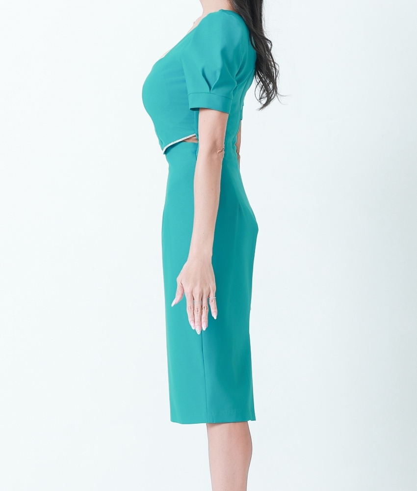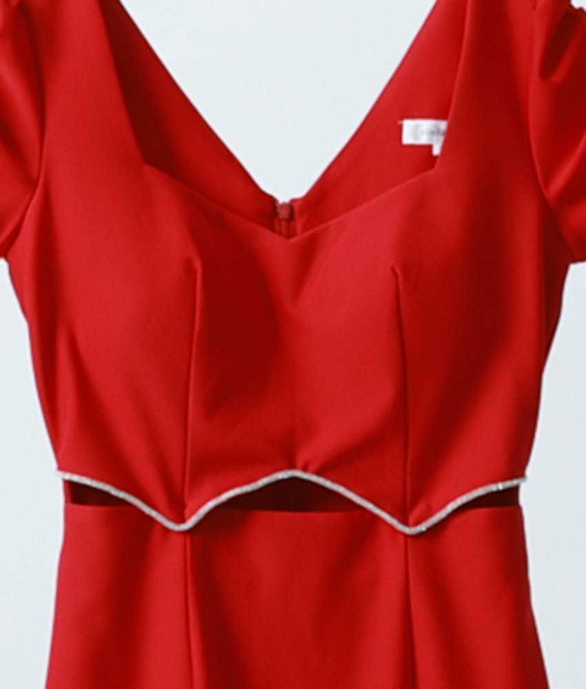 [韓国製][rinfarre]グリーン・レッド・ウエストビジュー・半袖・パフスリーブ・タイト・ミディアムドレス・ワンピース[山崎みどりちゃん着用] 《送料&代引き手数料無料》mygr [cd-k06205gi]