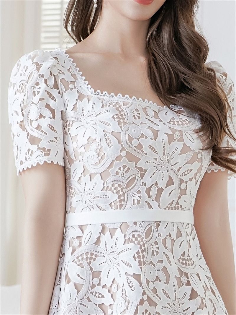 [ERUKEI]ホワイト・スクエアネック・総レース・半袖・Aライン・ミニドレス・ワンピース[送料無料] [lk-e25050]