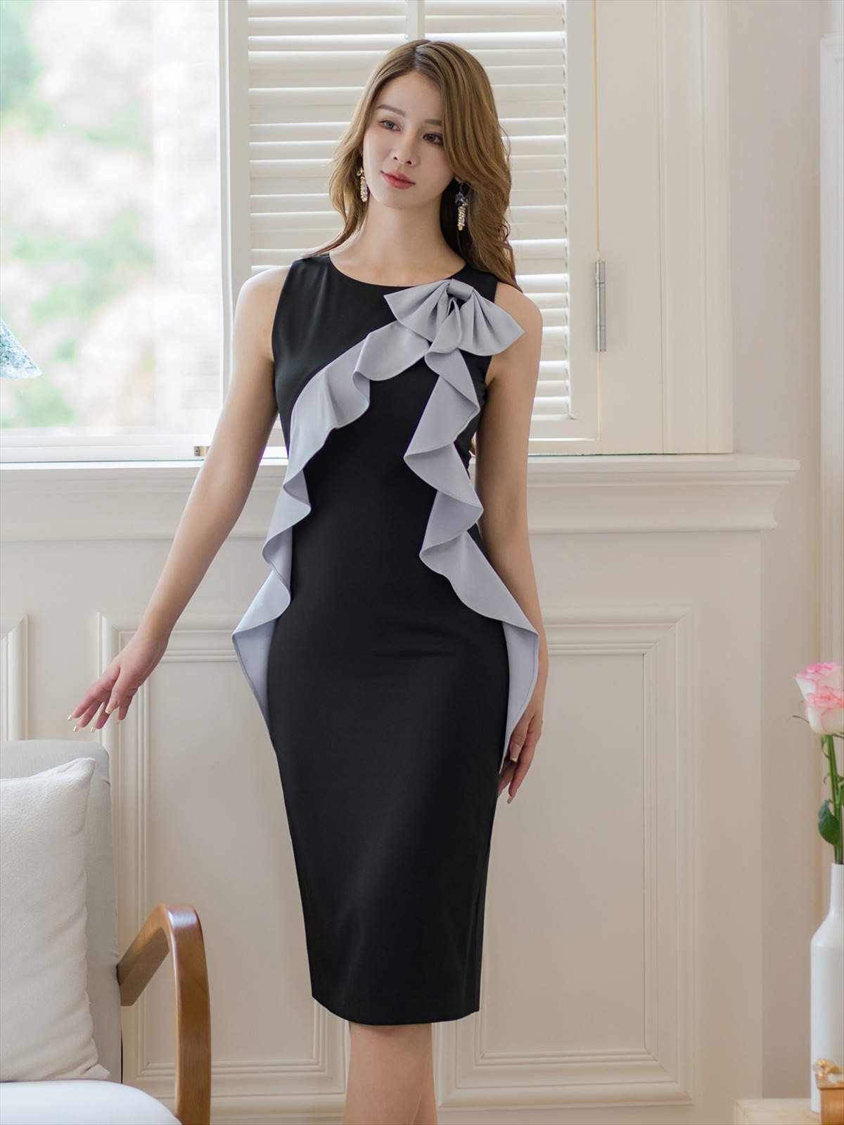 [ERUKEI]ホワイトxベージュ・ブラックxグレー・ノースリーブ・バイカラー・リボン・ミディアムドレス・ワンピース[送料無料] [lk-e24132]