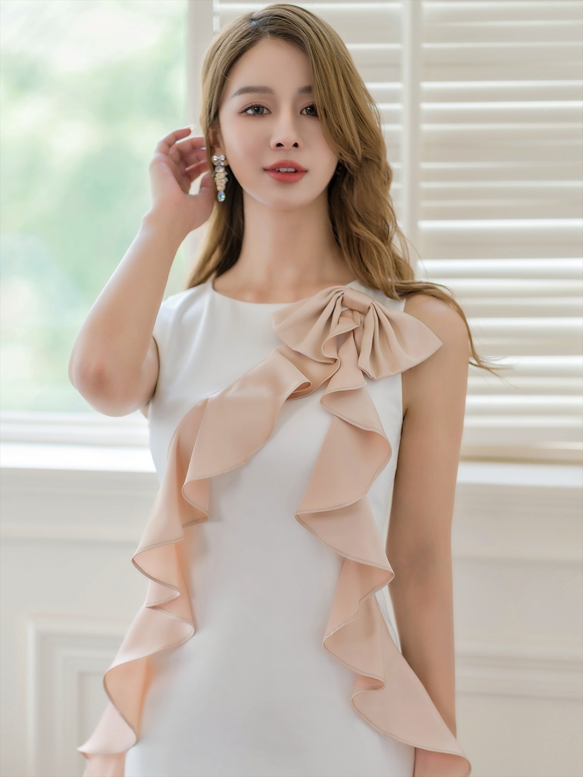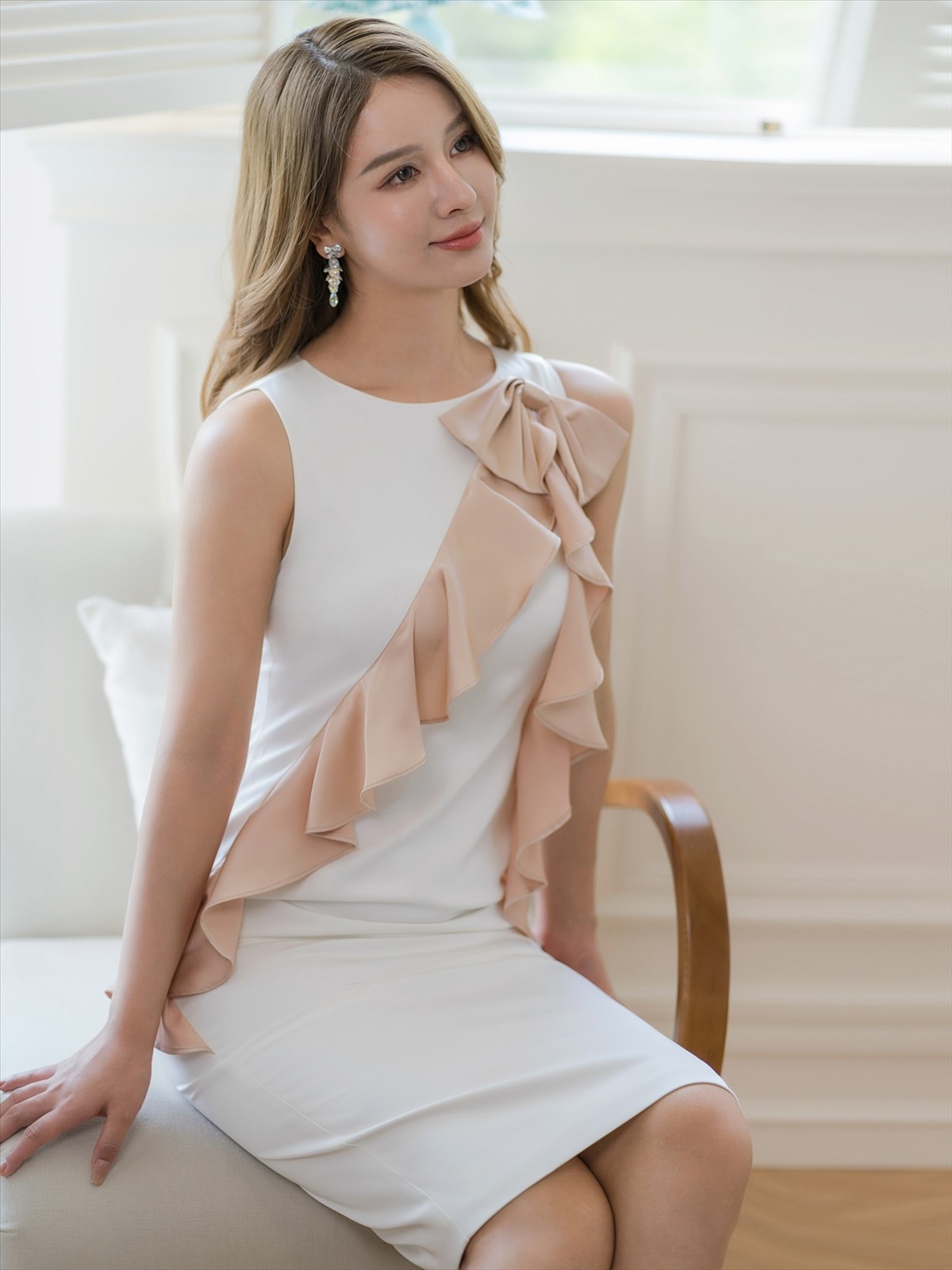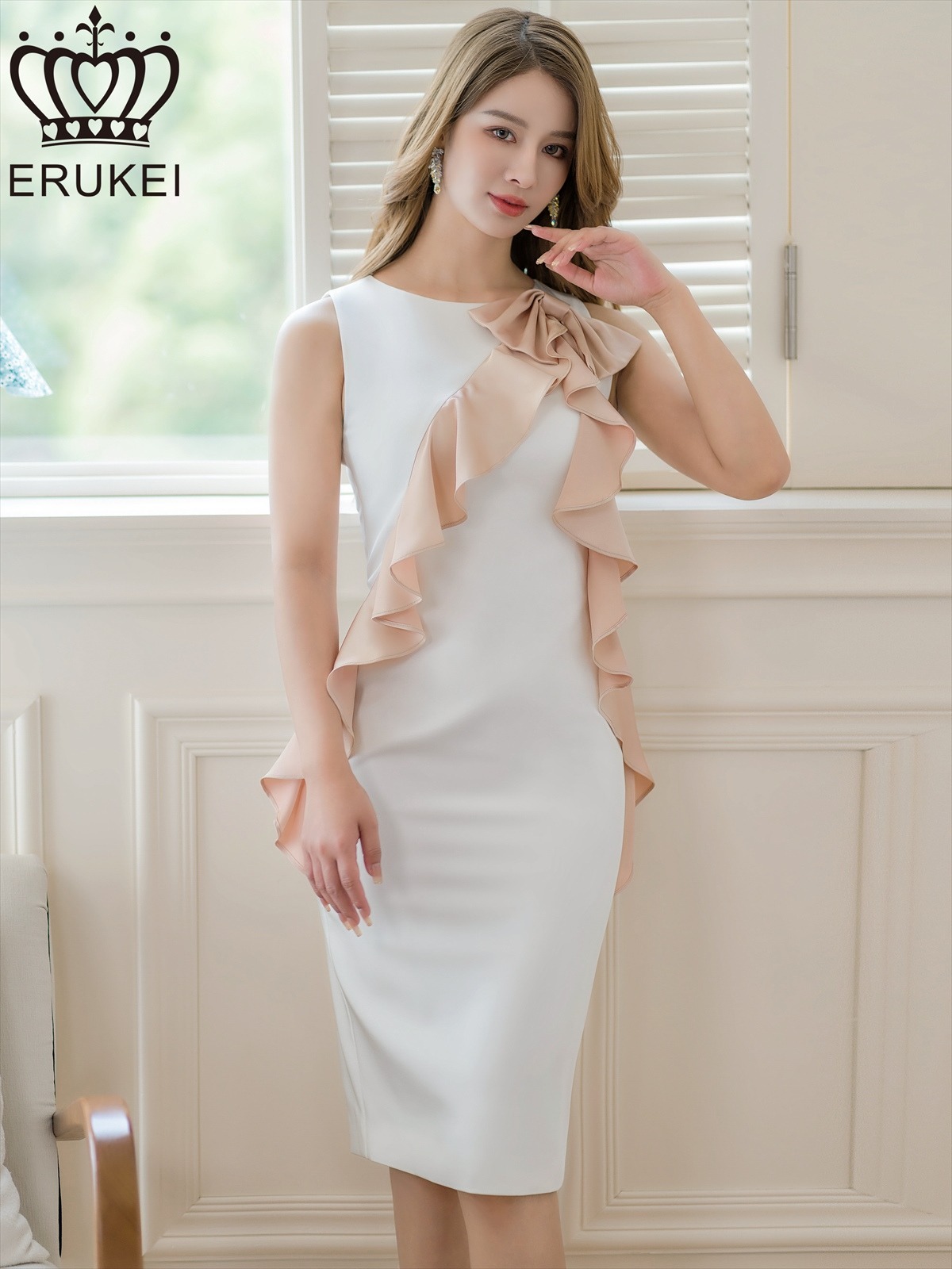 [ERUKEI/GINZA COUTURE]ベージュ・ホワイト・イエロー・レッド・タイト・ノースリーブ・シンプル・肩リボン・ミディアムドレス・ワンピース[送料無料] [lk-c23039]