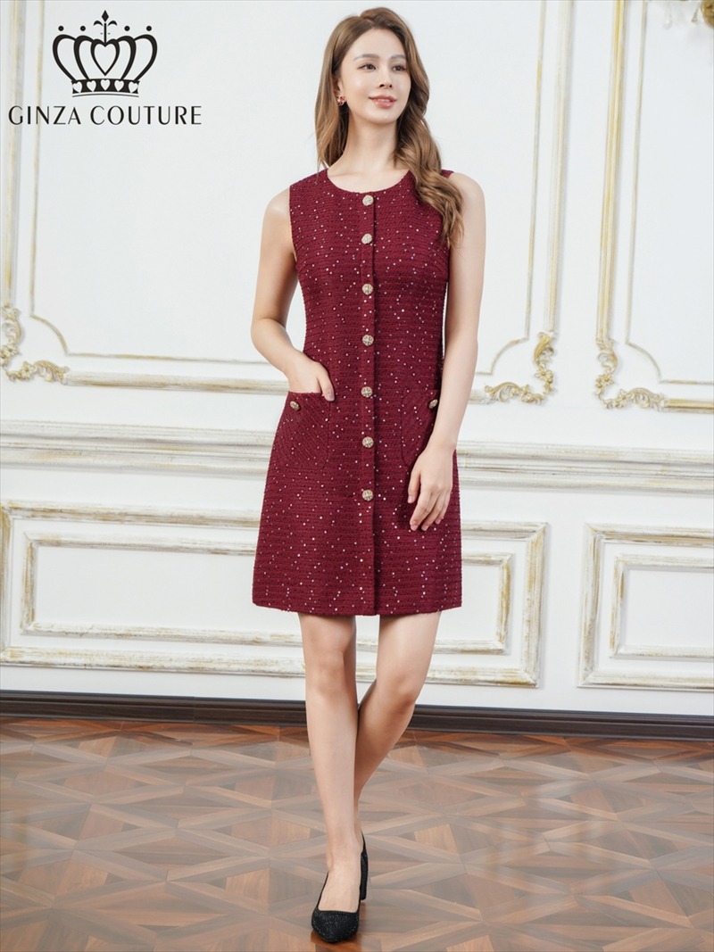 [ERUKEI/GINZA COUTURE]ホワイト・ブラック・ワインレッド・ネイビー・グレー・ノースリーブ・ツイード・スパンコール・ポケット・Aライン・ミニドレス・ワンピース[送料無料] [lk-c25082]