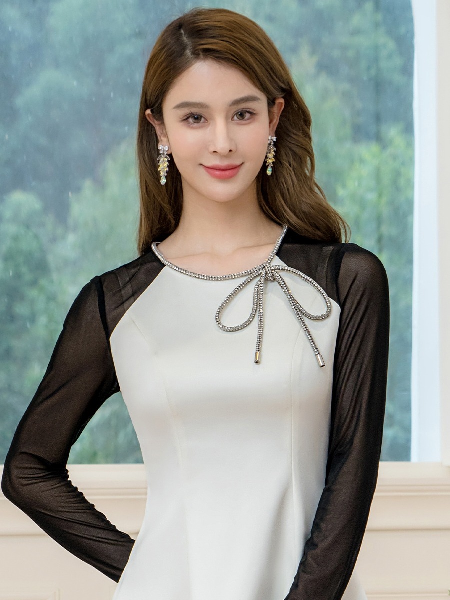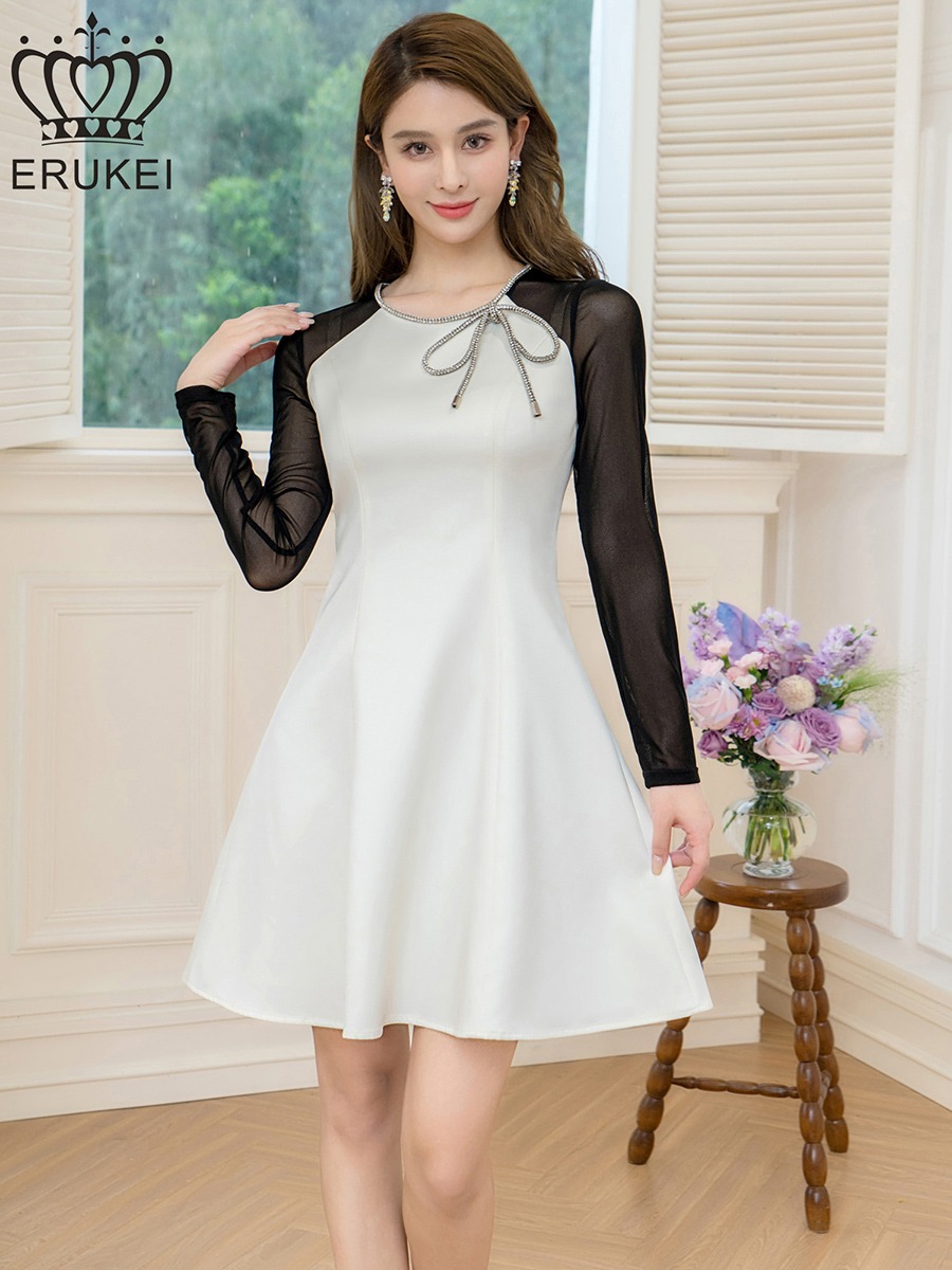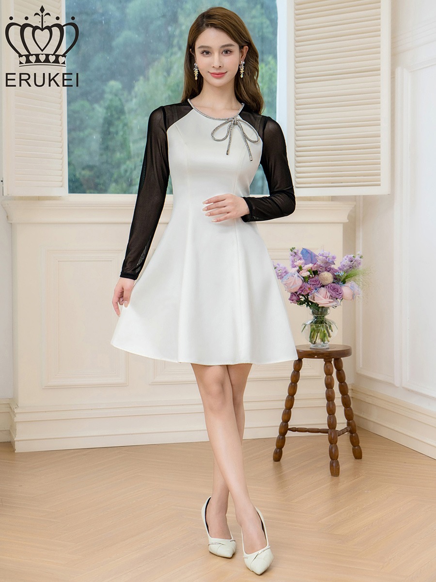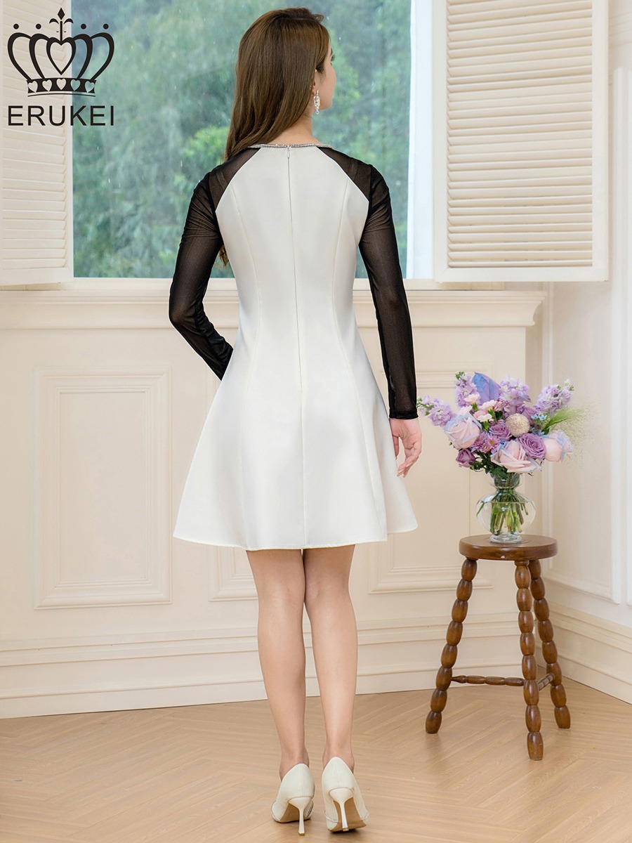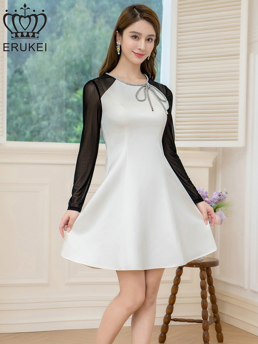 [ERUKEI]ホワイト×ブラック・サテン・ネット・ラインストーン・長袖・Aライン・ミニドレス・ワンピース[送料無料] [lk-e25036]