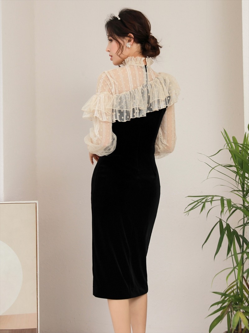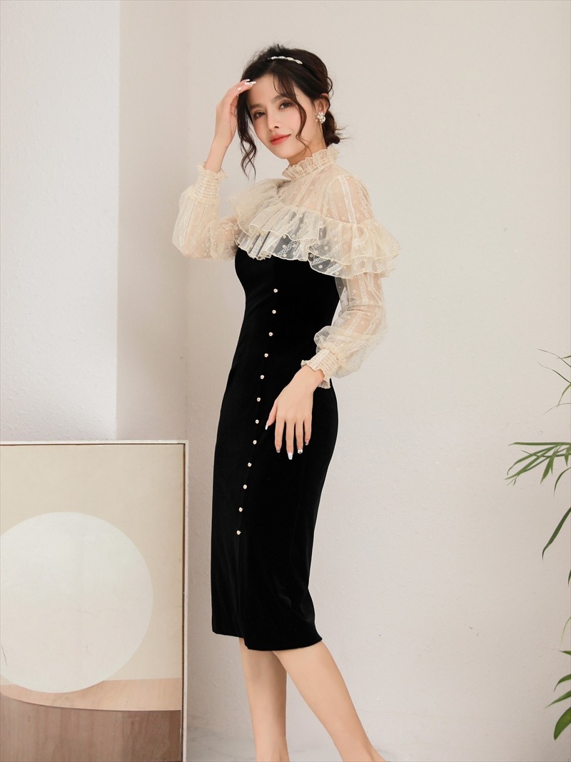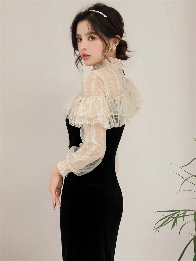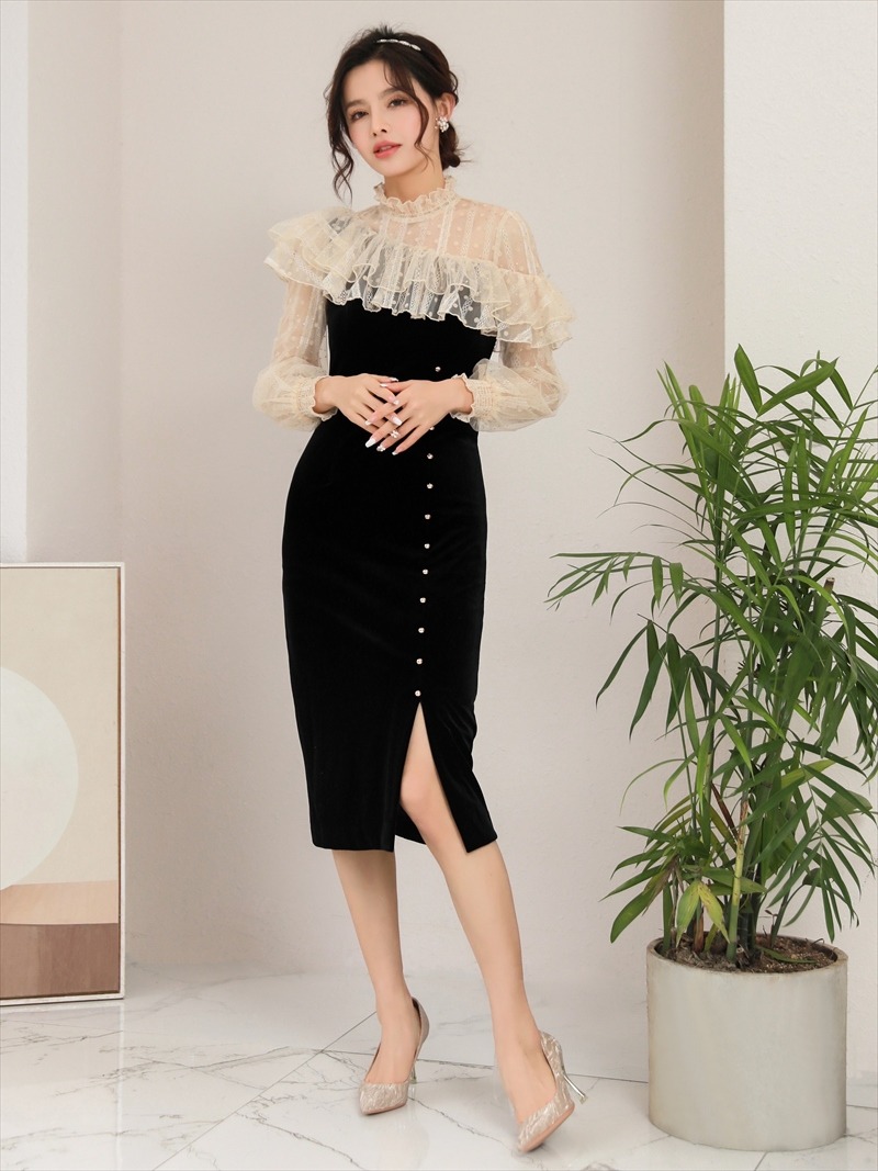 [ERUKEI/SETTAN]ブラック・レース・ベロア・フリル・長袖・タイト・ミディアムドレス・ワンピース[送料無料] [lk-s2045]