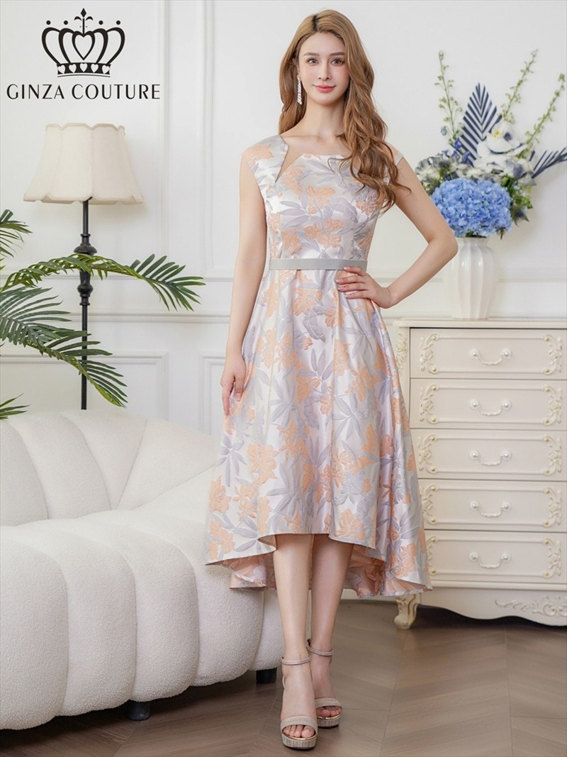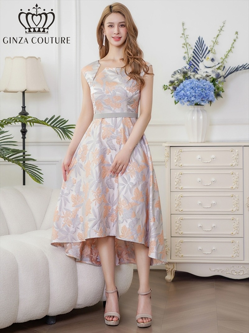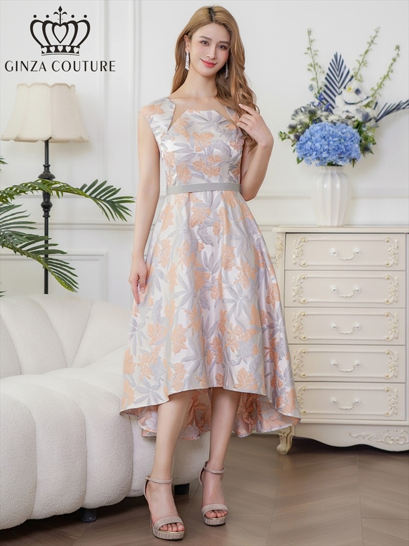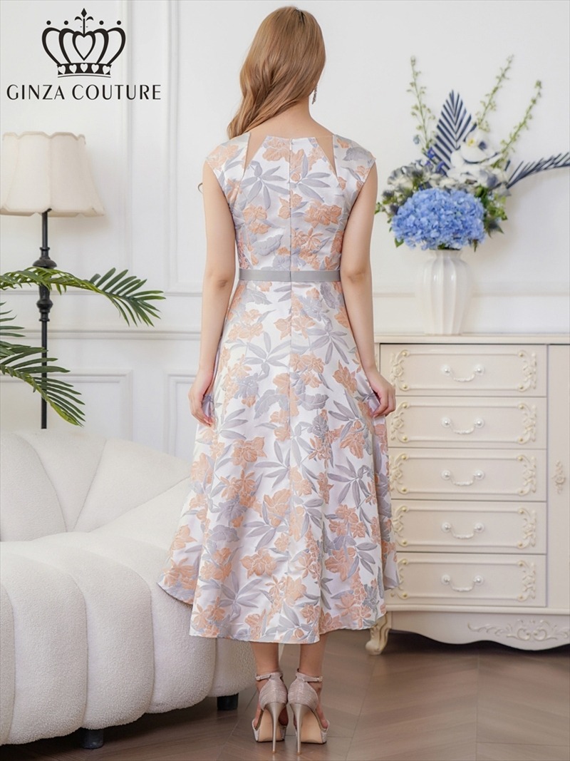 [ERUKEI/GINZA COUTURE]フレンチスリーブ・カットアウト・花柄 ジャガード・フィッシュテール・Aライン・ミディアムドレス・ワンピース[送料無料] [lk-c25483]