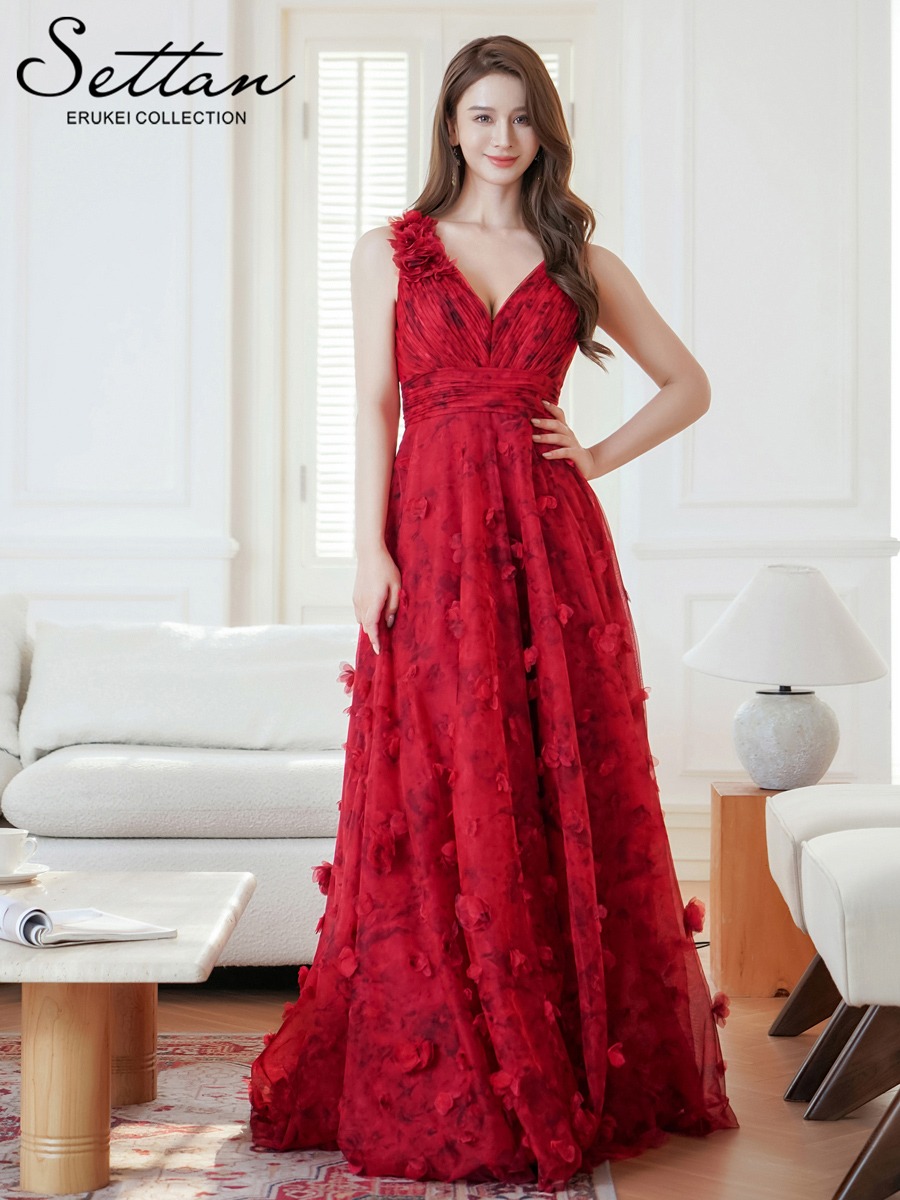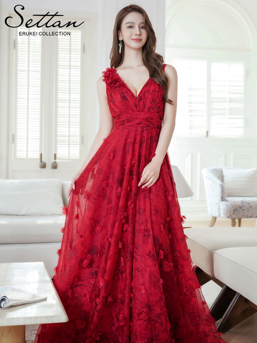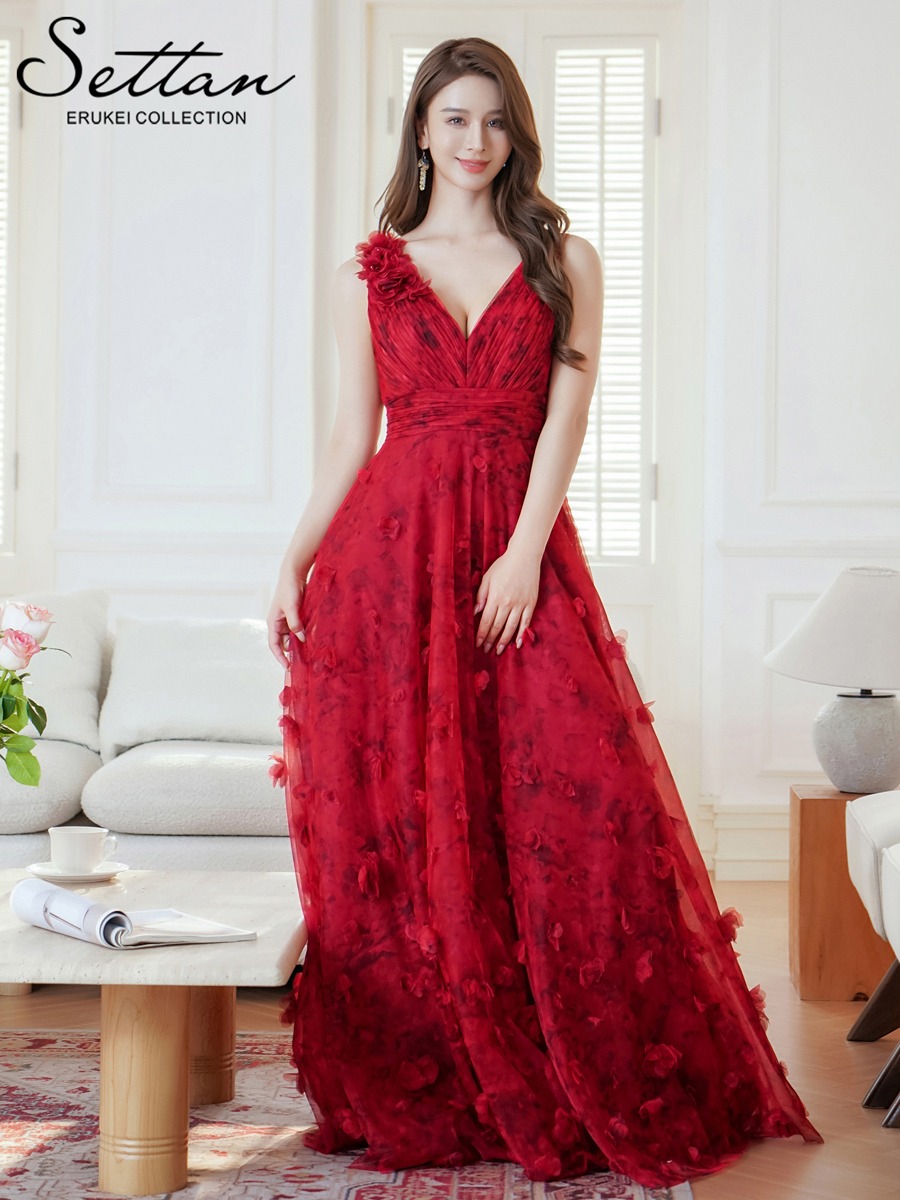 [ERUKEI/SETTAN]ワインレッド・立体フラワー・プリント・チュールレース・Vネック・ノースリーブ・ロングドレス[送料無料] [lk-s36112]